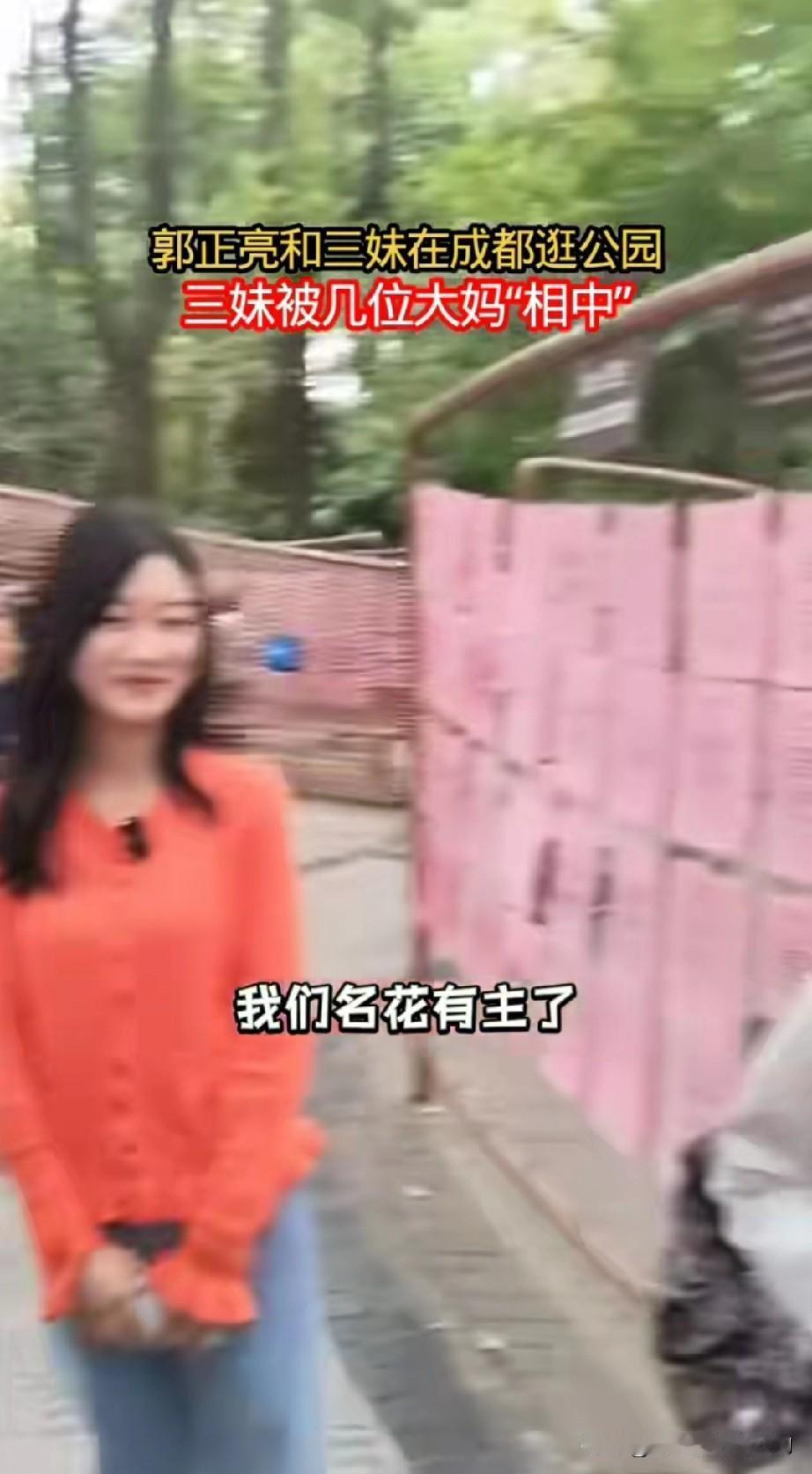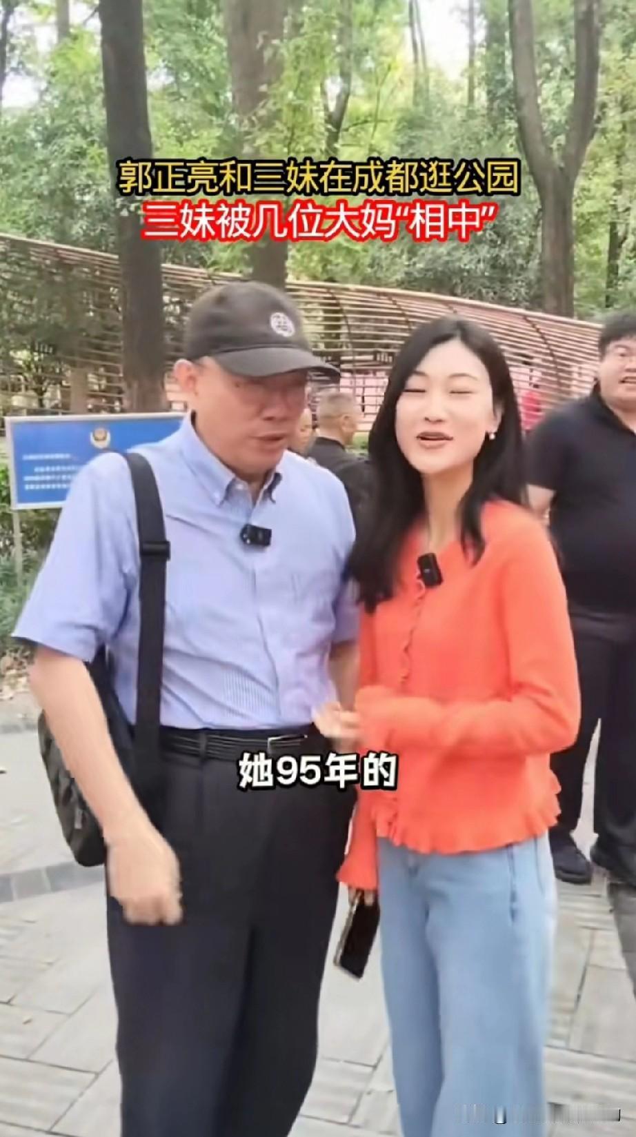 郭正亮化身三妹“父亲”,直接长了一辈儿。 两人一块儿逛成都人民公园,三妹被男孩家乡相中,郭正亮说三妹是她女儿。男孩家乡赶紧问几几年出生的,郭正亮说三妹95年,三妹害羞了,满脸通红地指着老郭说:“亮哥女儿99年的。” 把男孩儿家长弄迷糊了,问她需要啥条件的。三妹笑着说不用了,男孩儿家长恍然大悟:名花有主了。 老郭是个捣蛋鬼,冒充三妹父亲,不过看着还真像。