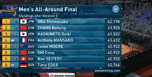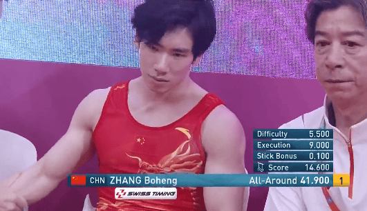 第三轮结束,张博恒在吊环项目中得到14.600分,总分41.900分,升至第二。