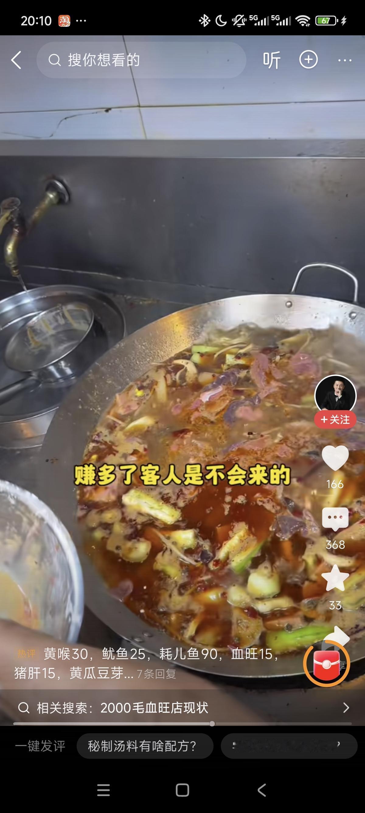 像这样的“黑店” 工商部门就应该彻底给封杀掉了! 看了以后气得我牙痒痒,他这毛血旺竟然要1888,你问他。是不是有一点贵?他说你不吃就快走。就这个态度比蛋烘糕老婆婆还要恶劣!顾客是上帝,他竟然说话这么不留情面。怼的你哑口无言。就跟只有他这里才有毛血旺吃一样。 最后小伙问他能赚多少钱,他说:做的都是良心生意。就赚100块钱。(你信吗?反正我不信!)这老板简直吹牛不打草稿,跟我们没买过菜一样。 黄喉30,鱿鱼25,耗儿鱼90,血旺15,猪肝15,黄瓜豆芽10,30+25+90+15+15+10=185,再加上水电燃气房租,我估计300本不到,赚个1600绰绰有余。 这个服务态度,这个价格你会去吃吗?