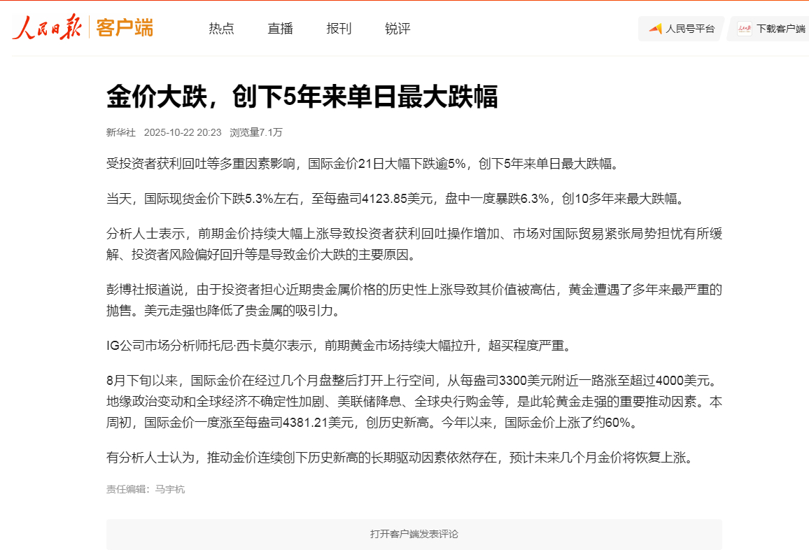 当天,国际现货金价下跌5.3%左右,至每盎司4123.85美元,盘中一度暴跌6.3%,创10多年来最大跌幅。