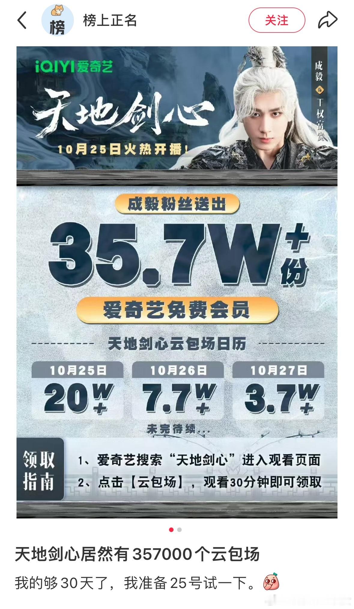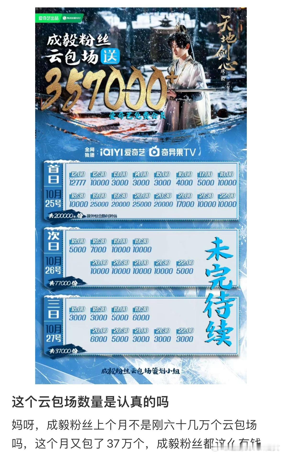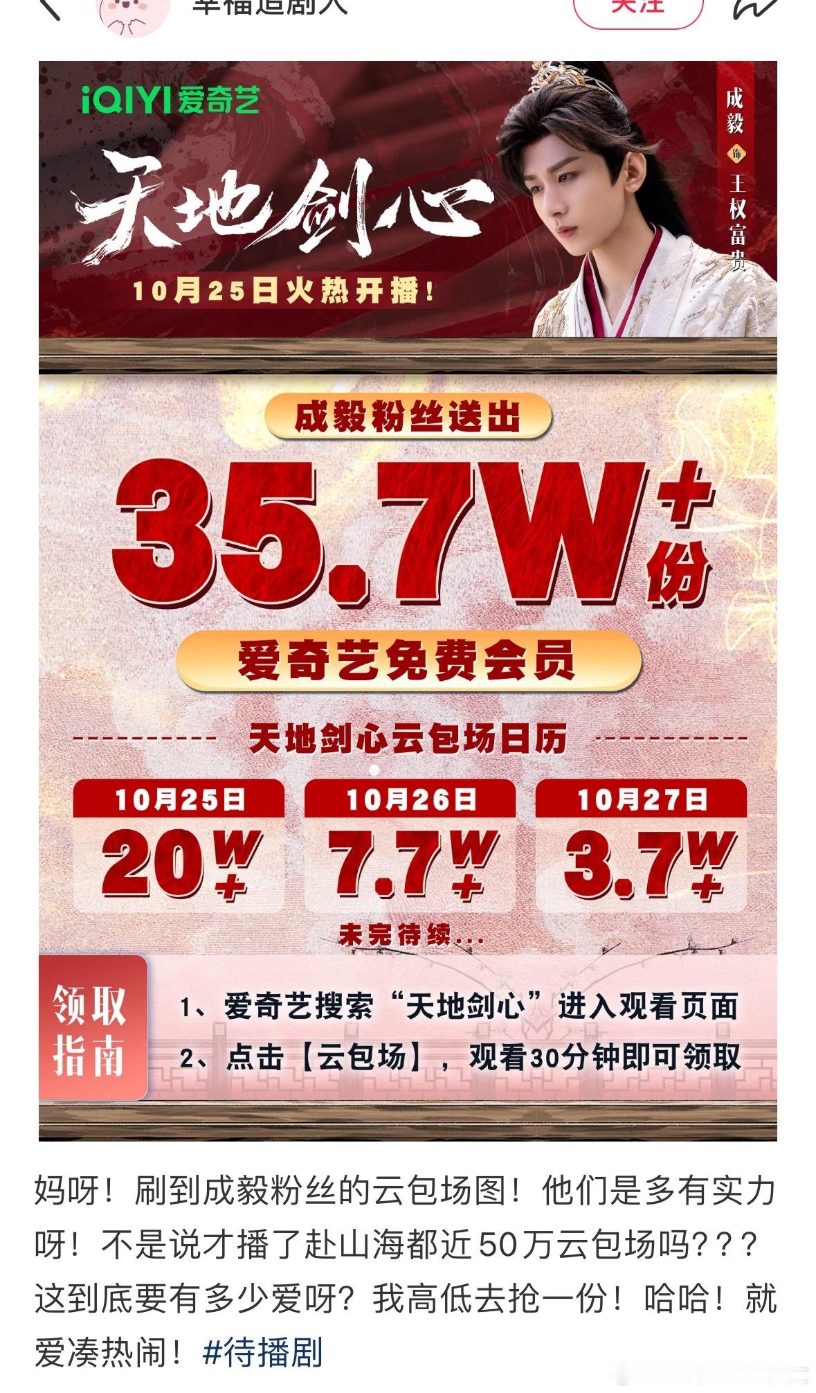 成毅粉丝35.7万云包场刷到好多路人都被成毅粉丝惊呆了,上个月刚包了近2000万,天地剑心仅仅统计登记的成毅粉丝开播前三天就有35.7万云包场了,还不包括散粉、主创、品牌商等,路人们都被惊到了,更何况业内。成毅粉丝就这两个月的云包场都可以投资拍一部剧了吧,在目前的长剧市场这样的真金白银的号召力非常难得可贵,对成毅足够的爱,足以证明成毅是多么的优秀,活粉是真多。天地剑心10月25日不见不散