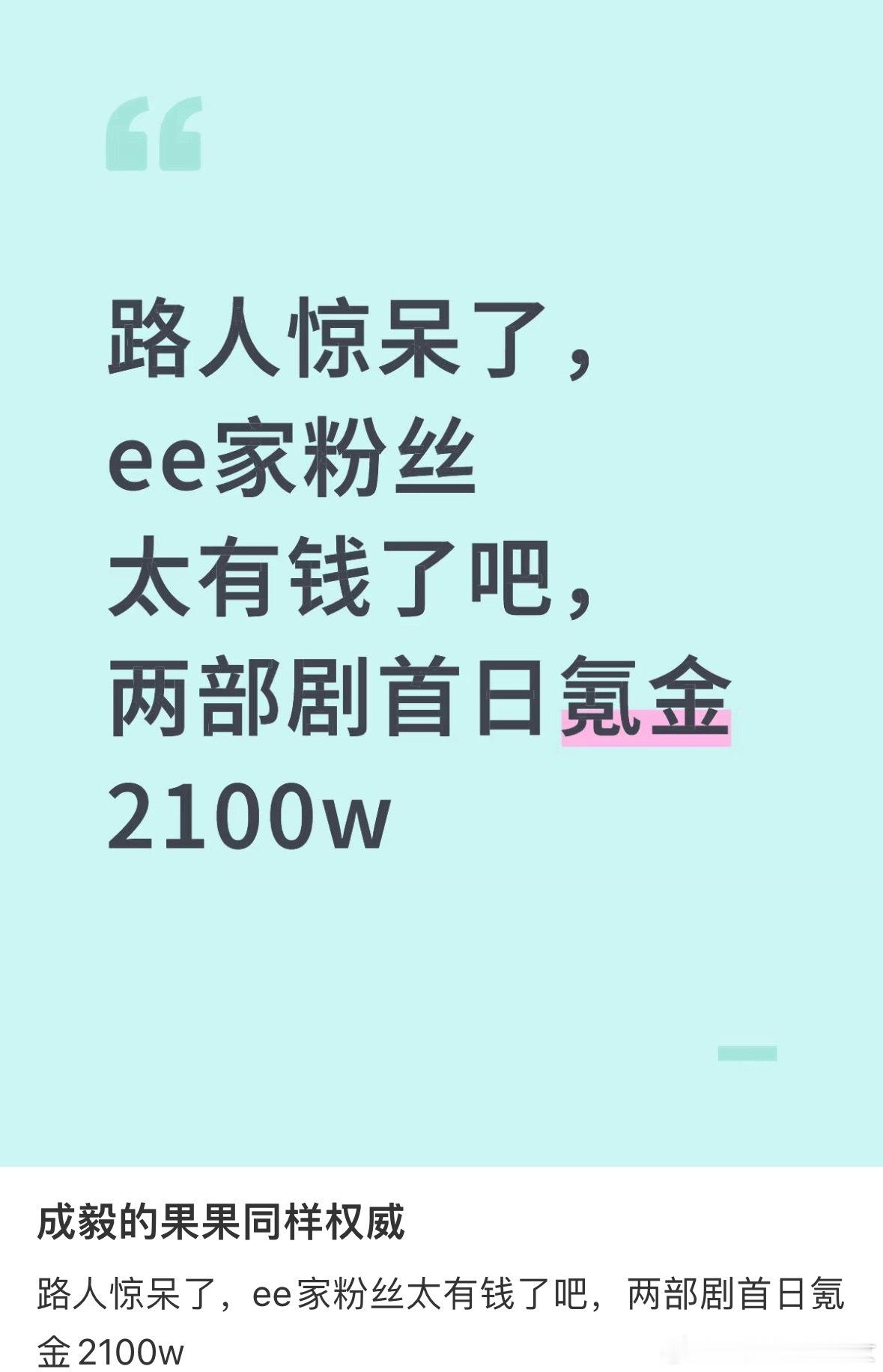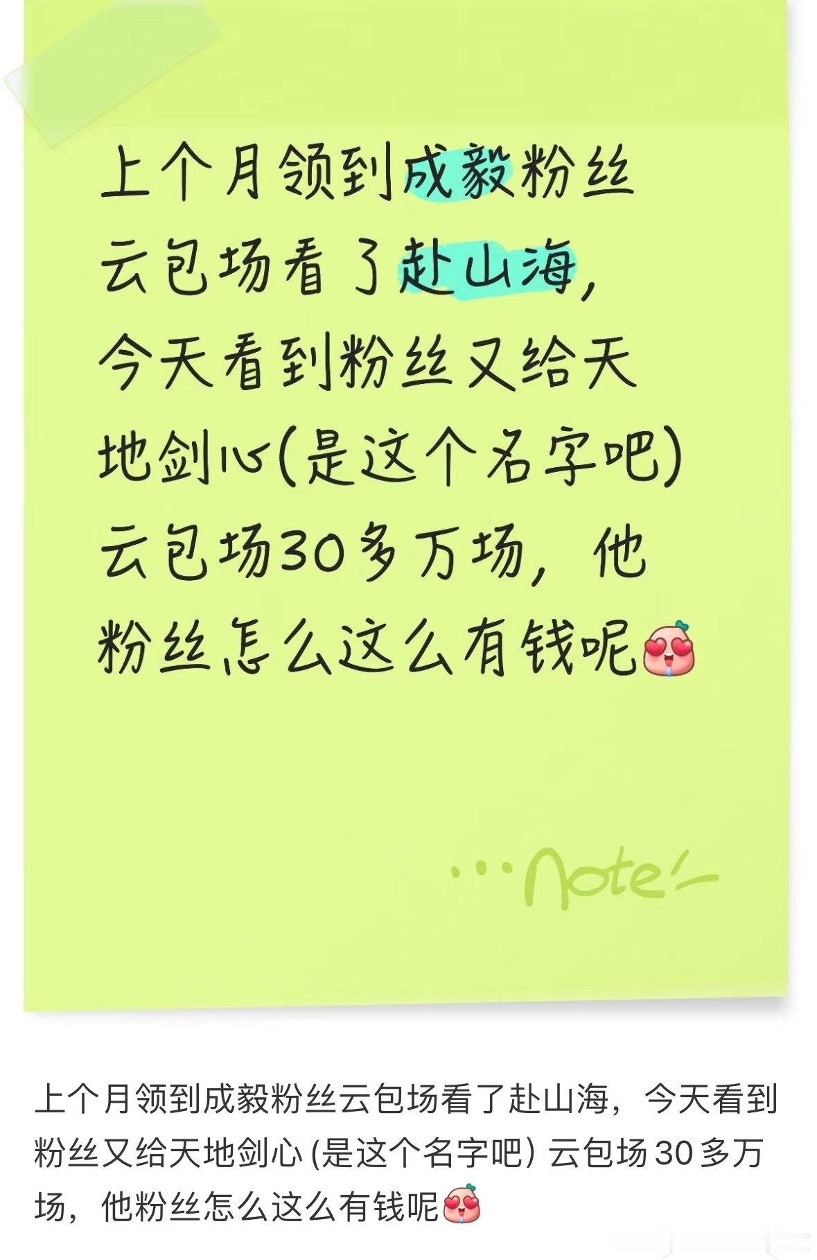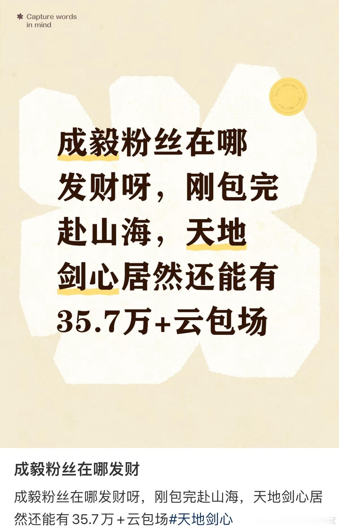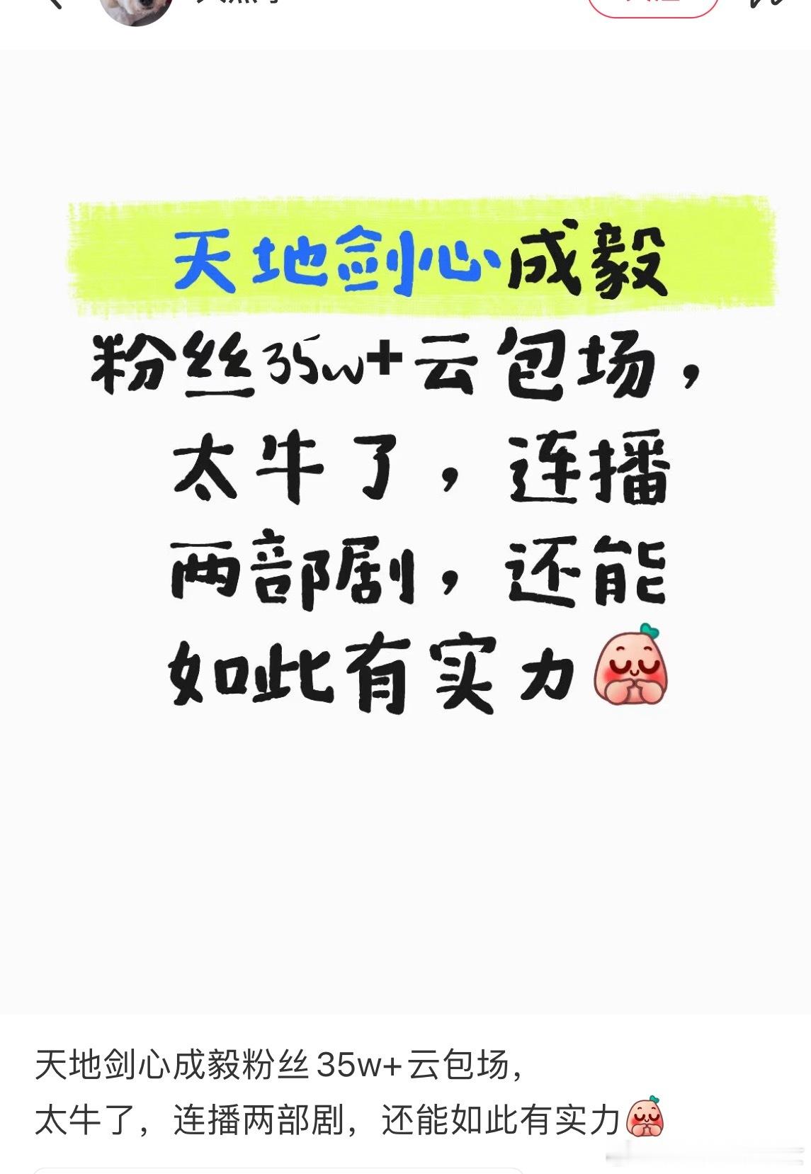 成毅粉丝35.7万云包场刷到好多路人都被成毅粉丝惊呆了,上个月刚包了近2000万,天地剑心仅仅统计登记的成毅粉丝开播前三天就有35.7万云包场了,还不包括散粉、主创、品牌商等,路人们都被惊到了,更何况业内。成毅粉丝就这两个月的云包场都可以投资拍一部剧了吧,在目前的长剧市场这样的真金白银的号召力非常难得可贵,对成毅足够的爱,足以证明成毅是多么的优秀,活粉是真多。天地剑心10月25日不见不散