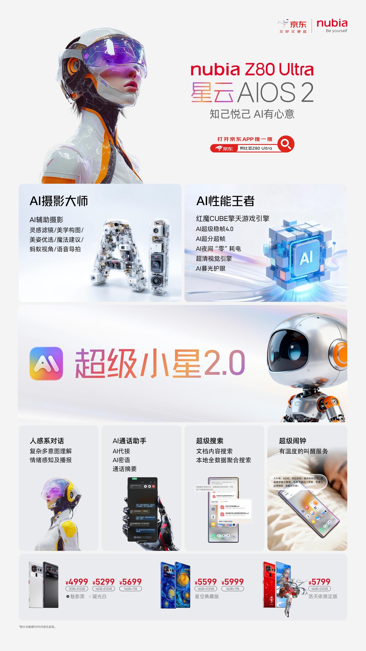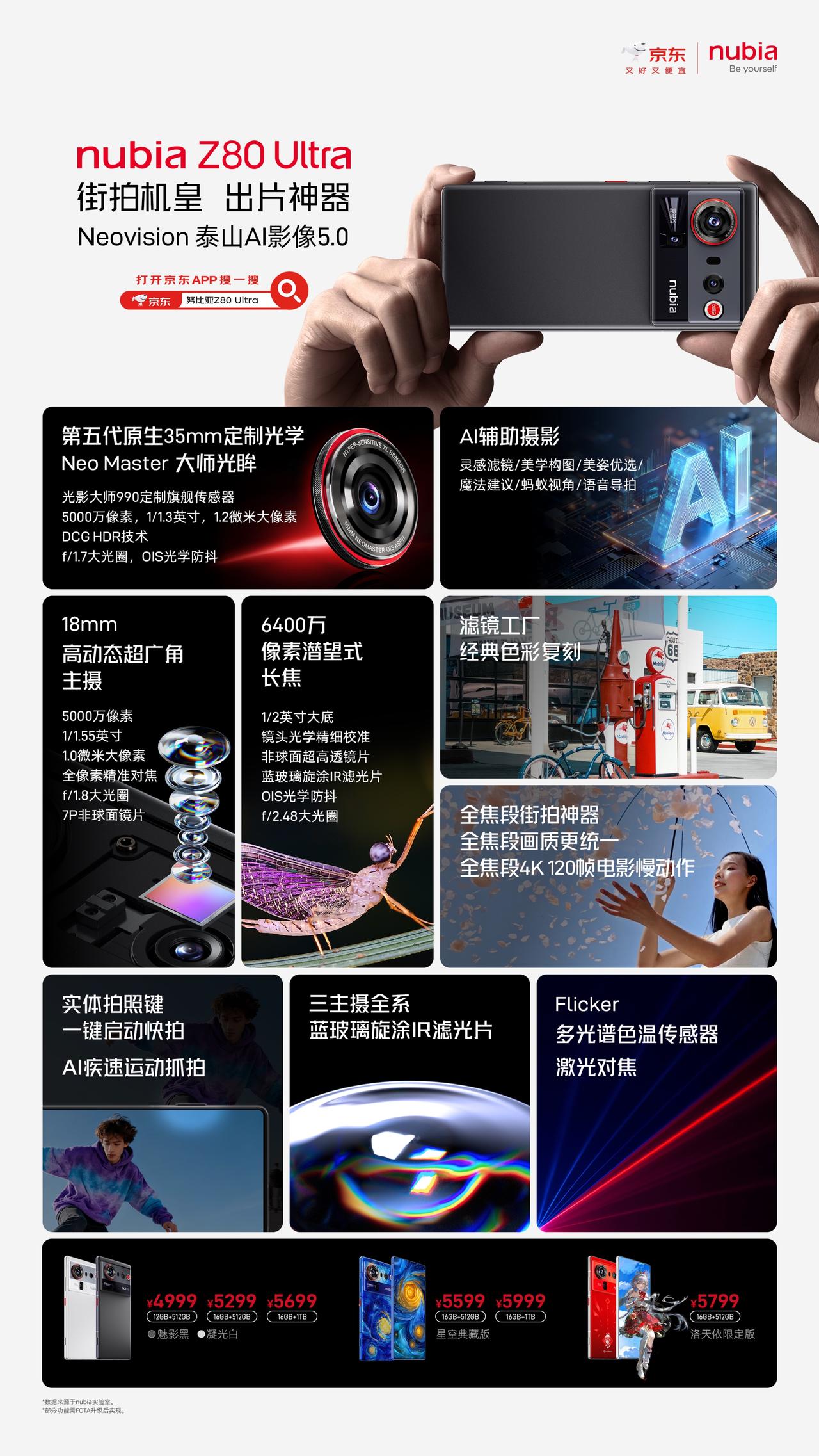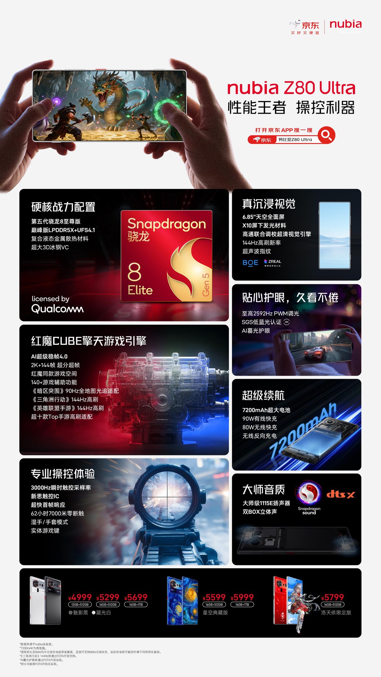 搭载35mm1/1.3英寸大底人文主摄5000万像素,5000万像素1/1.55英寸18mm大底定制广角,1/2英寸6400万像素85mm长焦镜头,双段式实体拍照键,15CM长焦微距,搭载AI摄影大师,支持美学构图,美姿优选,魔法建议、蚂蚁视角,滤镜工厂预置正负片、鲜艳、复古、布列松、浓郁、黑金,还有徐州老味菜滤镜和配套水印,支持个性化自定义调色,调整色温、饱和度和光影。 专业摄影套装,科技纳米皮、钛色铝合金边框与头层牛皮真皮手柄,智能相机控制条、实体机械操作键,支持T卡口扩展镜头转接口、冷靴接口。 搭载第五代骁龙8至尊版、红魔同款CUBE擎天游戏引擎,10.7Gbps巅峰版LPDDR5X、UFS4.1,2K 144Hz超分超帧, 6.85英寸真全面屏设计,144Hz刷新率,3000Hz瞬时触控采样率,1.5K分辨率,大师级1115E扬声器,有魅影黑、凝光白、星空典藏版、洛天依限定版四款配色。 7200毫安时第四代南海电池,90W有线充电,80W无线充电,系统为星云AIOS 2,USB 3.2 Gen1。 售价: 12GB+512GB 4999元 16GB+512GB 5299元 16GB+1TB 5699元 星空典藏版 16GB+512GB 5599元 16GB+1TB 5999元 洛天依限定版 16GB+512GB 5799元