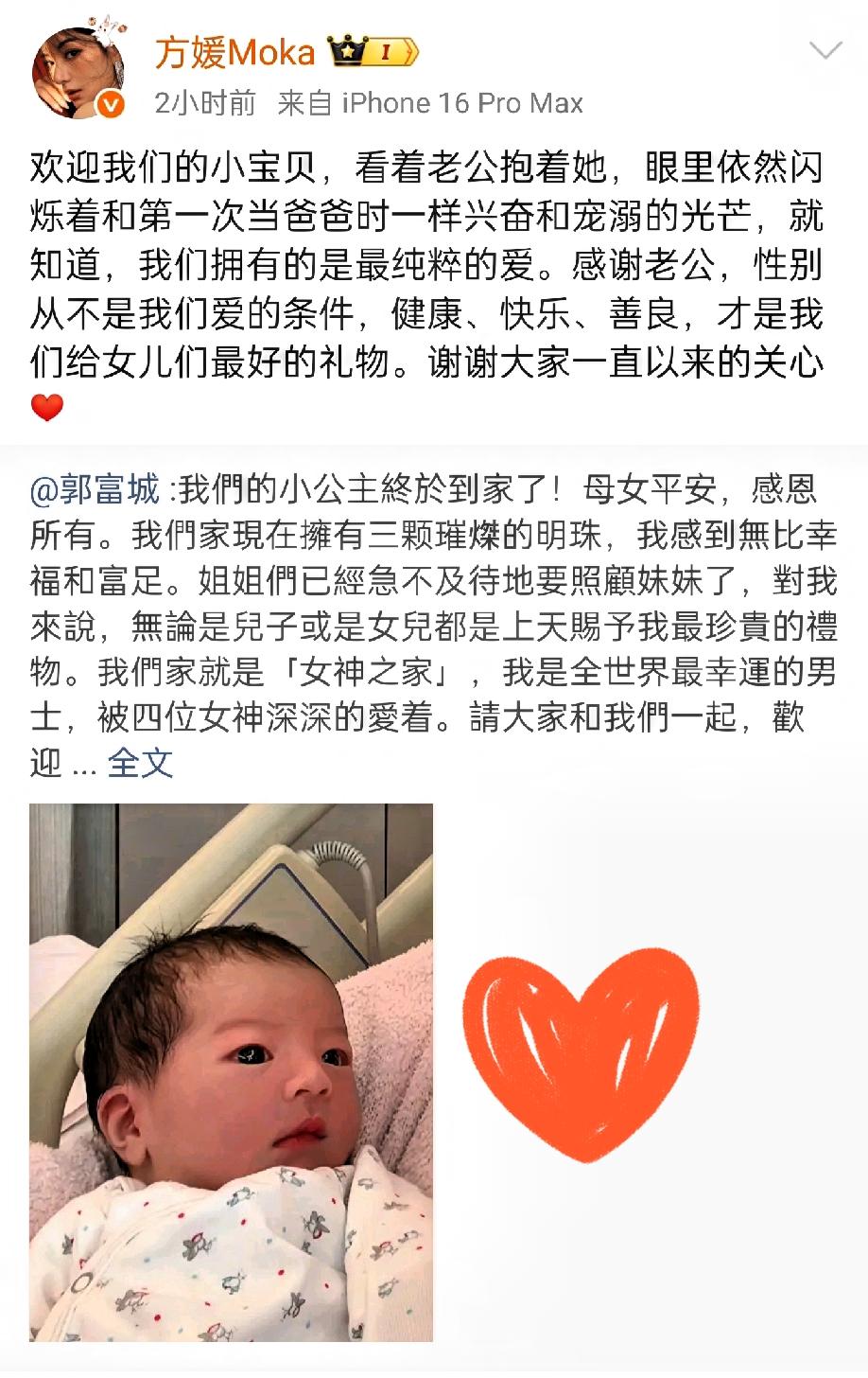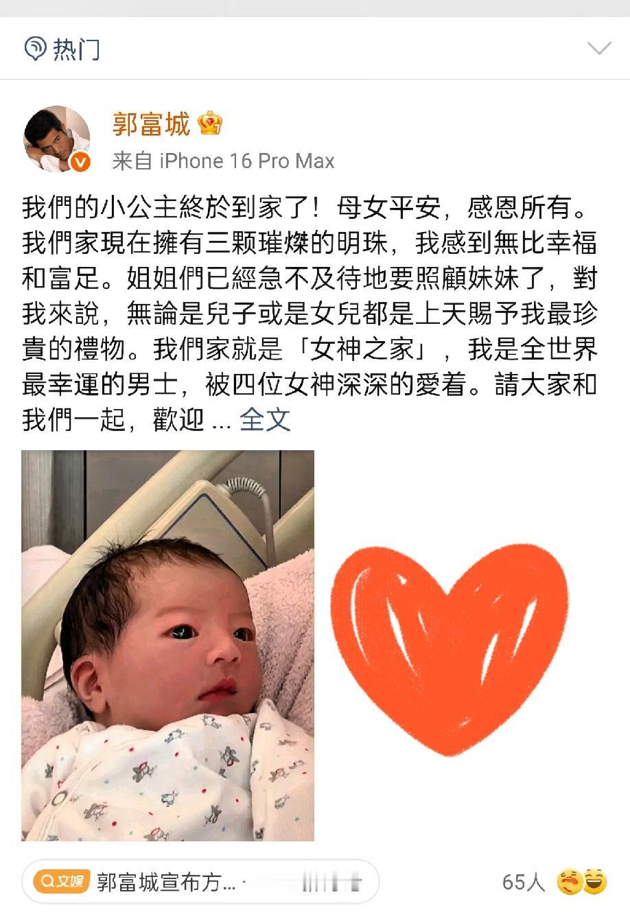 喜报! 今天最开心的就是郭富城了吧,不是因为老当益壮,也不是因为有小娇妻,而是喜迎三胎小公主。 这位59岁的天王在社交媒体上幸福地宣布:“我们的小公主终于到家了!母女平安,感恩所有。”文字间洋溢着初为人父的喜悦,尽管这已经是他第三次当爸爸。他家现在拥有“三颗璀璨的明珠”,自称是“全世界最幸运的男士”。 郭富城特意强调,无论儿子还是女儿,都是上天赐予他最珍贵的礼物。这番话仿佛是对外界猜测的有力回应——早在十月上旬的成都演唱会上,他就坦言从未刻意追求生男孩,每个孩子都会同样珍爱。 记者在养和医院外拍到了接宝宝出院的温馨画面。郭富城亲自驾车,与岳父岳母一同迎接新成员。面对镜头,他笑容满面地向记者道谢,整个人沉浸在幸福之中。 方媛随后转发了丈夫的贴文,并深情回应:“看着老公抱着她,眼里依然闪烁着和第一次当爸爸时一样兴奋和宠溺的光芒。”她坚定地表示,“性别从不是我们爱的条件”。 如今,郭富城家成了名副其实的“女神之家”,他被四位女性深深爱着。两位小姐姐已经迫不及待要照顾刚出生的妹妹,家庭氛围温馨有爱。 有趣的是,香港“四大天王”张学友、刘德华、黎明、郭富城全都生了女儿。张学友的两个女儿分别25岁和20岁;刘德华的独生女13岁;黎明的女儿7岁。郭富城如今带着三个女儿加入了这个特别的“岳父联盟”。 在娱乐圈这个五光十色的世界里,郭富城和方媛用行动诠释了爱的真谛——不分性别,不计条件。这个新生命的到来,不只是明星家事,更是对生命本身最美的礼赞。 各位读者你们怎么看?欢迎在评论区讨论。