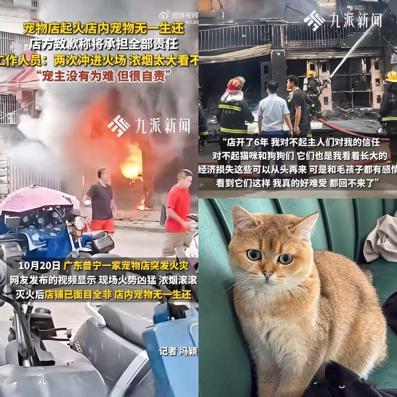 天哪! 身为铲屎官,看到这则新闻心都碎了 广东普阳一家经营6年的宠物店突发火灾,店员两次冲进火场,但店内所有宠物都无一生还 初步推断是闭店时电气故障,但官方调查仍在进行,店主公开致歉并承诺担责 店员已经尽力了,冲进去两次,但最让人心疼的,是那些无辜的小生命,它们什么都不懂,只能被困着等死[流泪] 希望都加强安全管理,有些宠物店真的挤得挪不开脚,完全没有风险意识