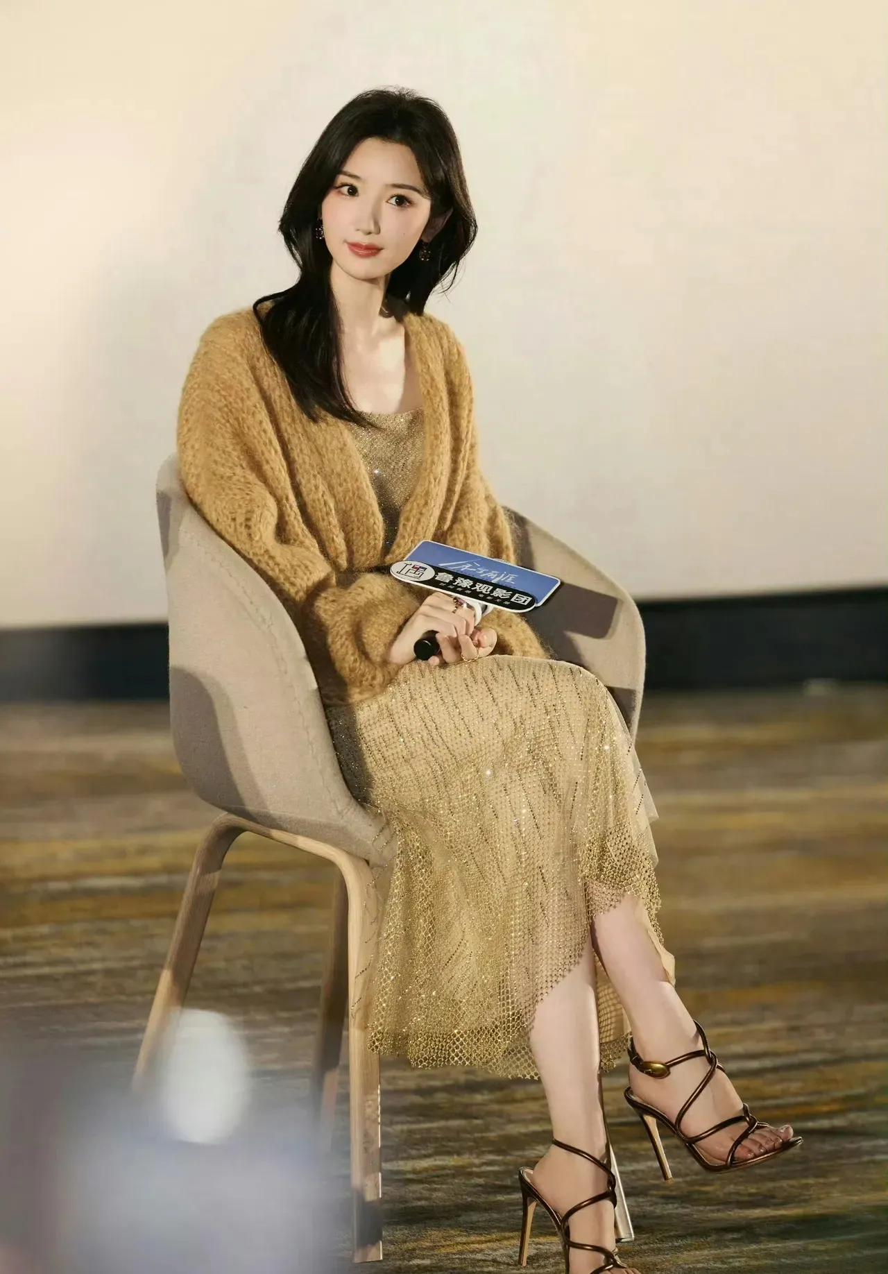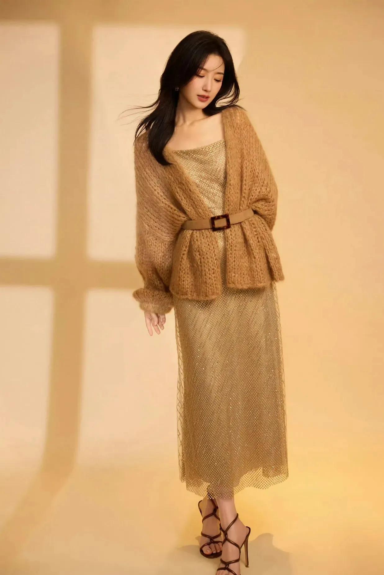 毛晓彤这身造型也太绝了! 毛晓彤最新造型美到失语!金色吊带裙缀满亮片,露背设计超吸睛,外搭棕色毛绒开衫甜酷又温柔。她笑容明媚自信,时尚感直接拉满,这状态谁看了不夸一句绝! 毛晓彤