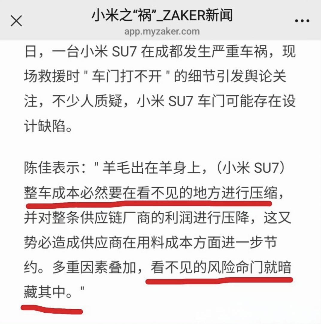 小米最近可以用“被围攻”来形容,这让我想起了2021年特斯拉的负面舆论处境,很像。 1,2021年特斯拉刹车门 2021年上海车展车顶女的维权,就是特斯拉那一年“刹车门”的顶峰。 当年的特斯拉最大的质疑就是“刹不住”,所有舆论集火点都是特斯拉单踏板模式会让人把油门当刹车,以及特斯拉是不是有不受控的自动加速问题? 质疑的声音很多,但是特斯拉并没有太多正面回应,也没有大量的投放媒体为自己辩解,用沉默和时间度过了这段艰难的时间。 幸运的是,自从车顶女以后,特斯拉再也没有一起汽车“自动加速”的事故。这也是对之前特斯拉多起自动加速事故的回应,自此以后针对特斯拉大规模的“刹车问题”舆论消失了。 2,小米这次有什么不同? 小米今年有两次重大舆论危机: 4月份的交通事故起火,和10月份的酒驾交通事故。 这两起事故涉及辅助驾驶,汽车着火,门锁打不开,特别是10月成都中门锁打不开事故,给网友的冲击比较大,因为很多人亲眼目睹救援无法开门,起火现场视频。 图2: 提到小米汽车的“省成本”,也是这次舆论攻击的重点(虽然有点莫须有),把这些事故跟小米的质量,和安全联系起来。 小米目前的处境跟特斯拉很像: 不太好的媒体关系,友商也不想让你好过,都靠企业个人IP(雷军和马斯克)支撑品牌形象。 不同的是: 特斯拉后来用事实打消了消费者的顾虑,趟过去就封神,再也没有大规模的负面舆论。 小米汽车能不能用实际的行动,(比如设计上的改进,或者证明这两起交通事故存在功能误用),以消除消费者对其(安全)上的顾虑? 最后,目前网上对于小米的攻击,大多有失公允且没有实际的证据,我本周会从工程的角度,公平的评价这两起事故。【来自懂车帝车友圈】
