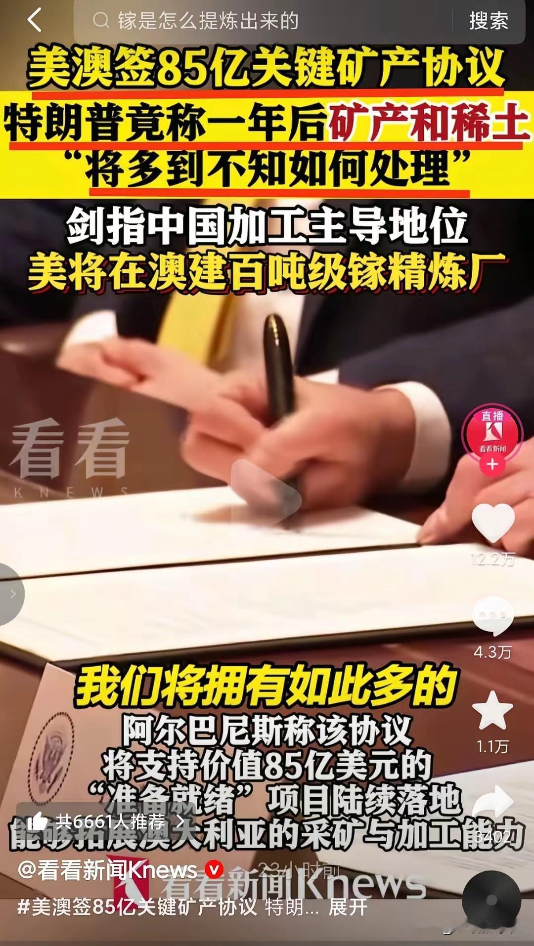 美澳现在估计肠子都悔青了! 他们后悔的不是签了那份85亿美元的关键矿产协议,也不是高调宣称“一年后稀土多到用不完”,而是低估了中国稀土产业链的真正壁垒——技术、成本、时间,缺一不可。 特朗普和阿尔巴尼斯的握手合影看似双赢,实则各怀算计。美国想空手套白狼,用政治协议撬动供应链;澳大利亚试图两头下注,既讨好盟友又舍不得中国市场。但现实很骨感:澳大利亚稀土储量仅占全球3%,且九成矿砂需运到中国精炼。所谓的“替代供应链”,连自家智库都直言“至少需10年才能初见雏形”。 中国稀土的优势从不靠资源垄断。全球90%的精炼产能、439项独家萃取专利、第四代分离技术,才是真正的护城河。美澳即便砸钱建厂,成本也比中国高30%,环保和技术人才更是无解难题。更讽刺的是,美国唯一稀土企业MP Materials至今依赖中国技术授权,而澳大利亚莱纳斯公司的氧化镝生产线,最终仍需中国完成精炼。 协议签得轰轰烈烈,但政治秀终究难掩产业规律。特朗普需要选举噱头,阿尔巴尼斯想要安全承诺,可产业逻辑从不相信口号。中国稀土产业链三十年织就的网,岂是一纸协议能撕裂?