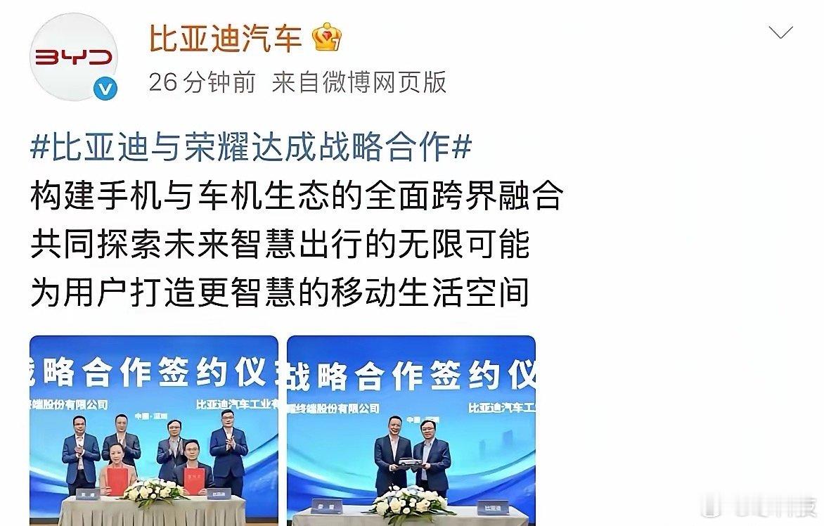 比亚迪和荣耀签了合作,两家难道要做两家公司以后要一起搞车载系统和手机的融合?这样应该车机以后会更加丝滑贯通一些,毕竟荣耀在这方面的专业能力是值得信赖的,相信比亚迪车机系统和现在相比也能进行本质的改变。
