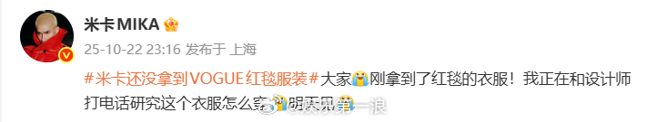 米卡回应没拿到VOGUE红毯服装米卡和设计师打电话研究衣服怎么穿 回应米卡还没拿到VOGUE红毯服装:“大家[泪奔]刚拿到了红毯的衣服!我正在和设计师打电话研究这个衣服怎么穿[泪奔]明天见[泪奔] ”