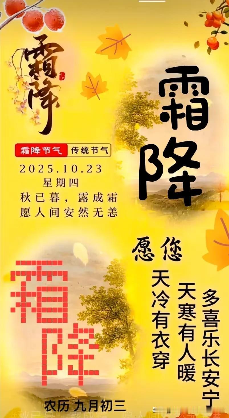 霜降来了!秋天收尾,这些实在讲究得记着 今儿霜降,秋天的最后一个节气总算到了,这意思就是冬天马上要敲门了 。早上出门踩在地上,能看见草叶上一层白花花的霜,那可不是天上掉下来的,是夜里天冷,水汽冻成的冰晶。 老辈传的说法特实在,“霜降吃柿,不会流鼻涕”,现在的柿子经霜一打,又软又甜,正好解馋 。还有“一年补透透,不如补霜降”,这天炖锅羊肉汤或者萝卜汤,暖身又润燥,比冬天再补管用多了 。 提醒大伙儿,这天气昼夜温差大,早上出门可得把外套穿好,尤其护好脚踝和肚子,别着凉 。路边的树叶落得更欢了,踩上去沙沙响,秋天就这么收尾了。 你们那儿霜降都爱吃点啥?评论区聊聊~今日霜降 霜降文案 霜降习俗 你好,霜降 今日霜降,是下雨好还是晴天好 今日霜降,你吃柿子了吗 霜降随笔 秋天的最后一个节气 图片由AI生成