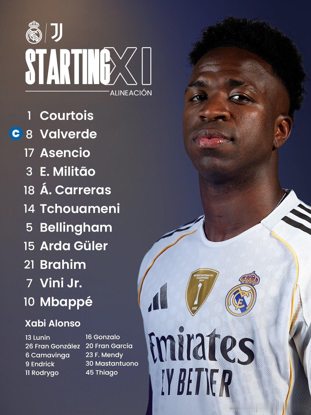 皇马首发:1-库尔图瓦、17-劳尔·阿森西奥、8-巴尔韦德、3-米利唐、18-卡雷拉斯、14-琼阿梅尼、5-贝林厄姆、15-居莱尔、21-迪亚斯、7-威尼修斯、10-姆巴佩