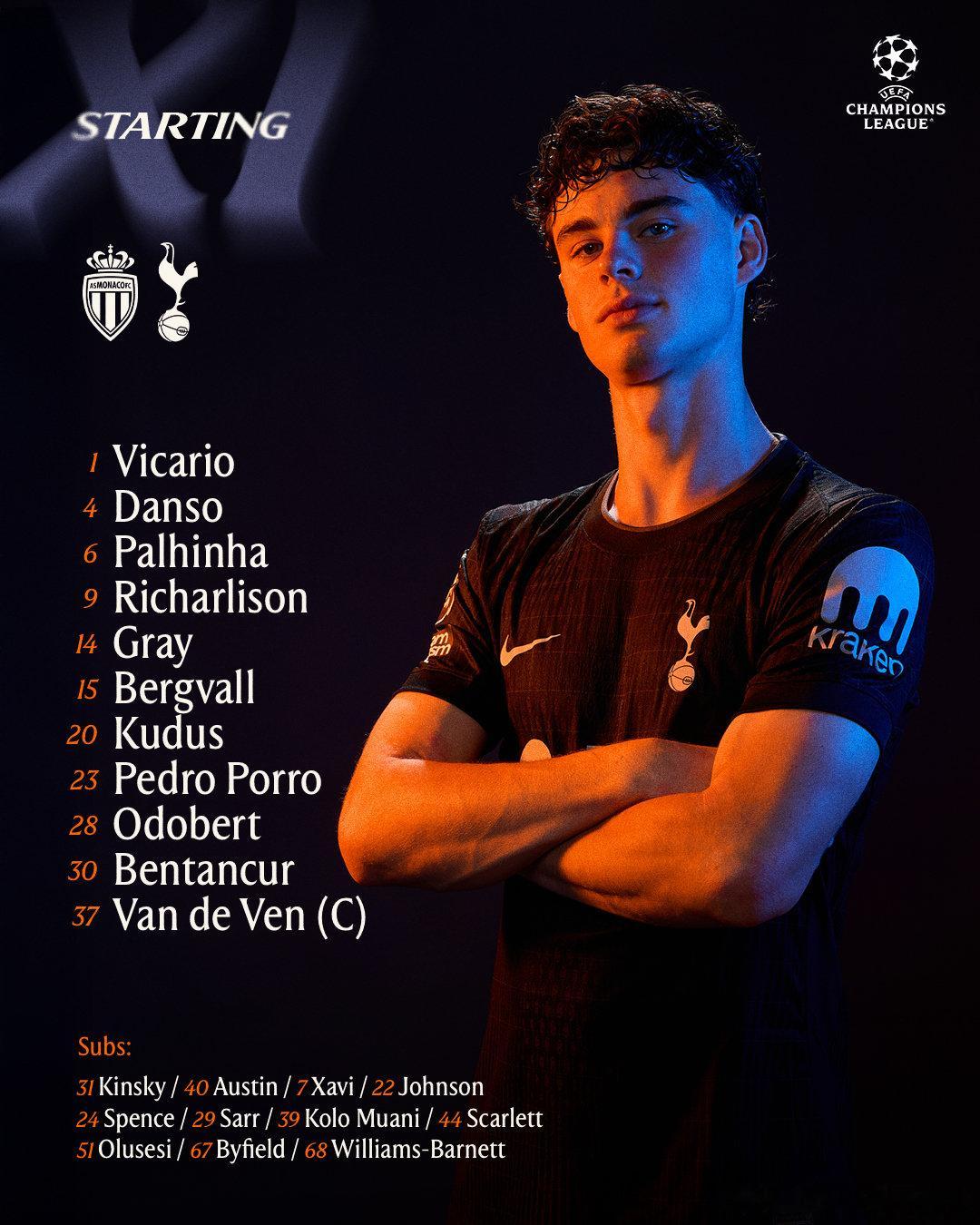 热刺首发:1-维卡里奥、4-丹索、6-帕利尼亚、9-里查利松、14-阿奇·格雷、15-贝里瓦尔、20-库杜斯、23-佩德罗·波罗、28-奥多贝尔、30-本坦库尔、37-范德文