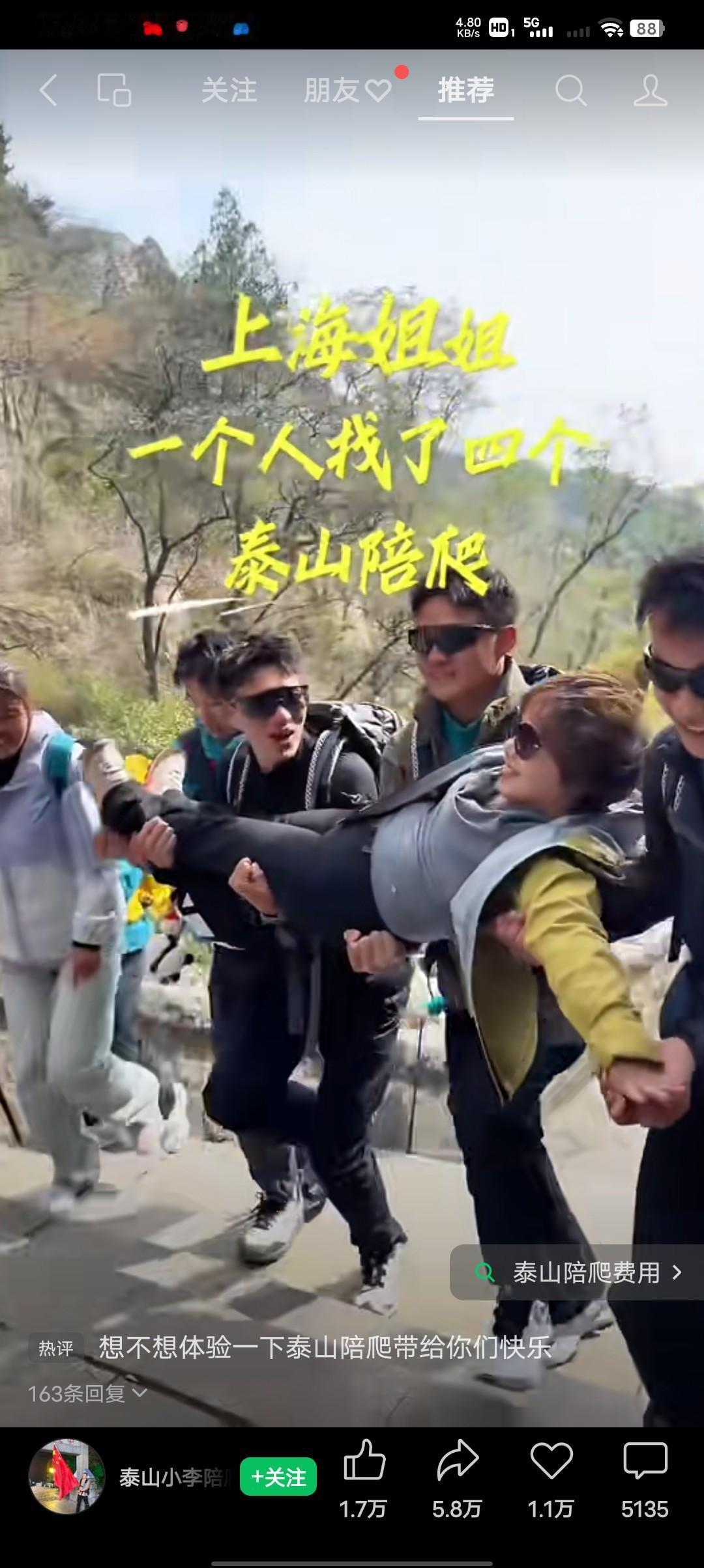 有人说既然左右不了男人,那就左右都是男人。哈哈,多霸气! 上海姐姐一个人点了4个泰山陪爬,情绪价值拉满。有人有想法没钱,有人有钱没想法,恰巧这位姐姐既有想法又有钱,这个姐姐干了让所有人羡慕的事。泰山常规陪爬价格:白天陪爬的费用通常在499到799元之间,夜间陪爬(为了看日出)费用会贵一点,在699到799元的范围内,也不错啊,花钱能买到情绪价值。 姐姐花了钱买到了自己想要的情绪价值,年轻人则用自己的能力赚到了钱。还有人说,比老公听话,比儿子有耐心。自己既然当不了皇后,那就花钱当女皇!这是不是每个女人都有的奢望呢?却没有几个女人能实现,钱虽然不能买到所有,但是可以让你拥有情绪价值啊!似乎也不错呢!好像有时候有钱也是好事,不然你就是有想法没钱也是白费!