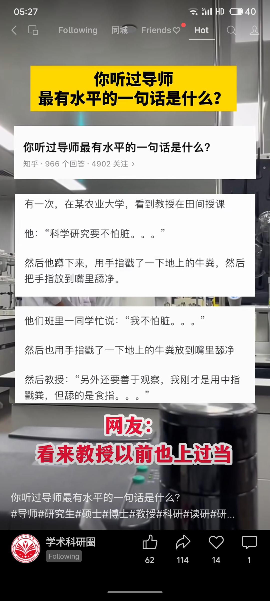 农大教授授课时,以中指戳牛粪却舔食指,告诫学生科研"要善于观察"。学生盲目模仿而失误,凸显科研中细致观察比形式上的"不怕脏"更为重要。