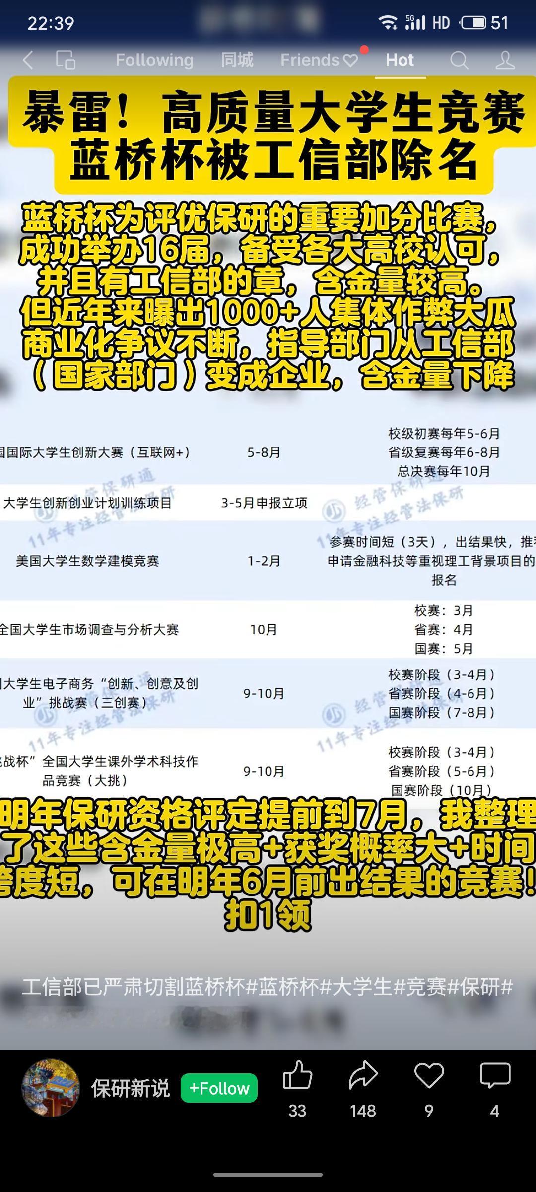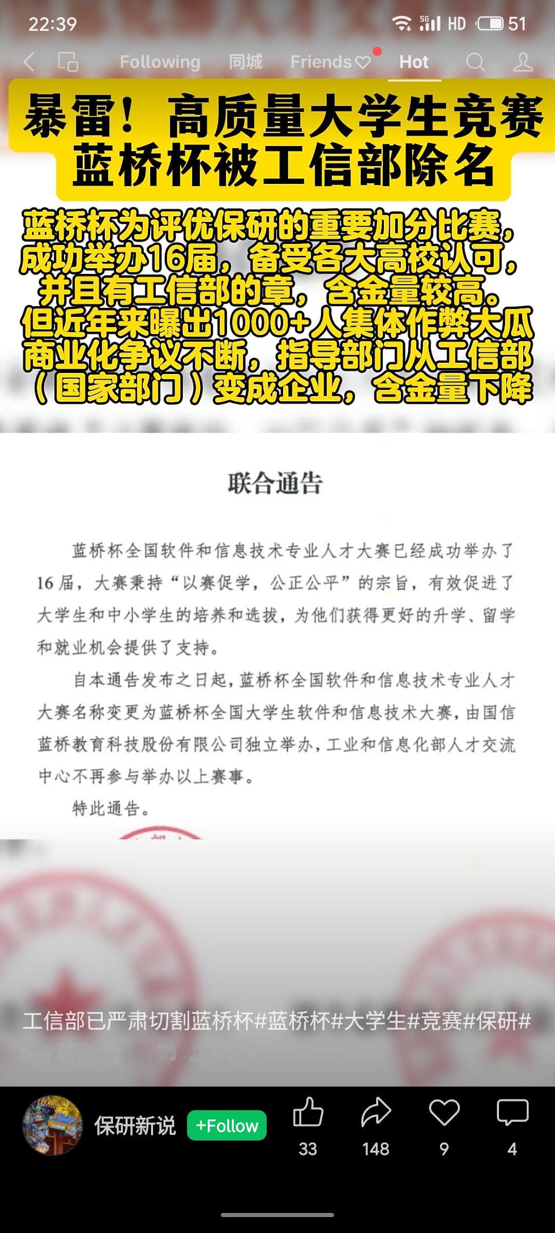 知名大学生竞赛"蓝桥杯"因曝出大规模作弊及商业化争议,被工信部终止合作,现由企业独立举办。其作为保研加分项目的权威性恐将受到影响。