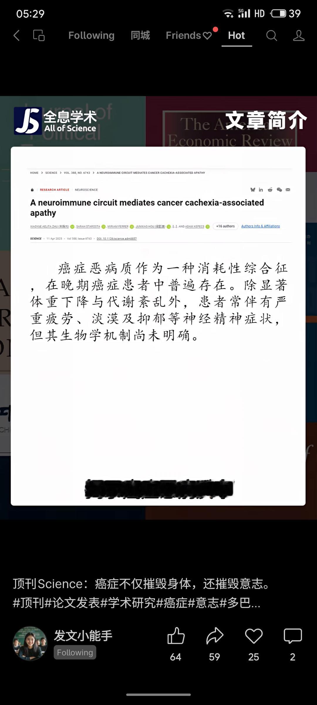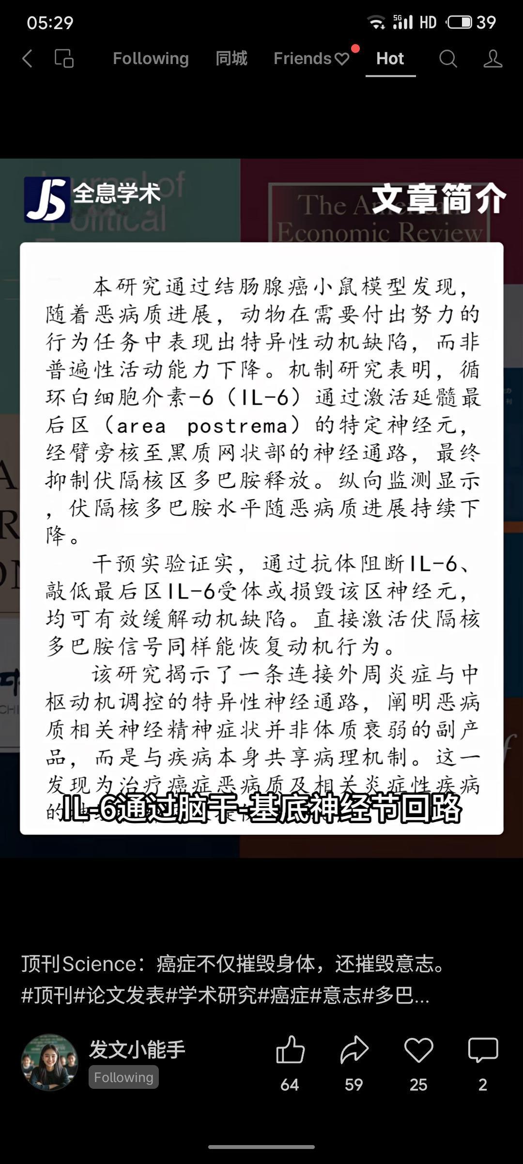 《科学》杂志最新研究揭示,癌症恶病质患者表现出的动机缺陷(如淡漠)并非体质衰弱所致,而是由特定神经通路介导:外周IL-6激活延髓最后区神经元,通过臂旁核抑制伏隔核多巴胺释放。干预该通路可恢复动机行为,为治疗提供了新靶点。