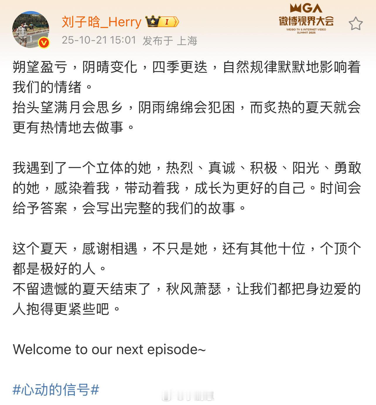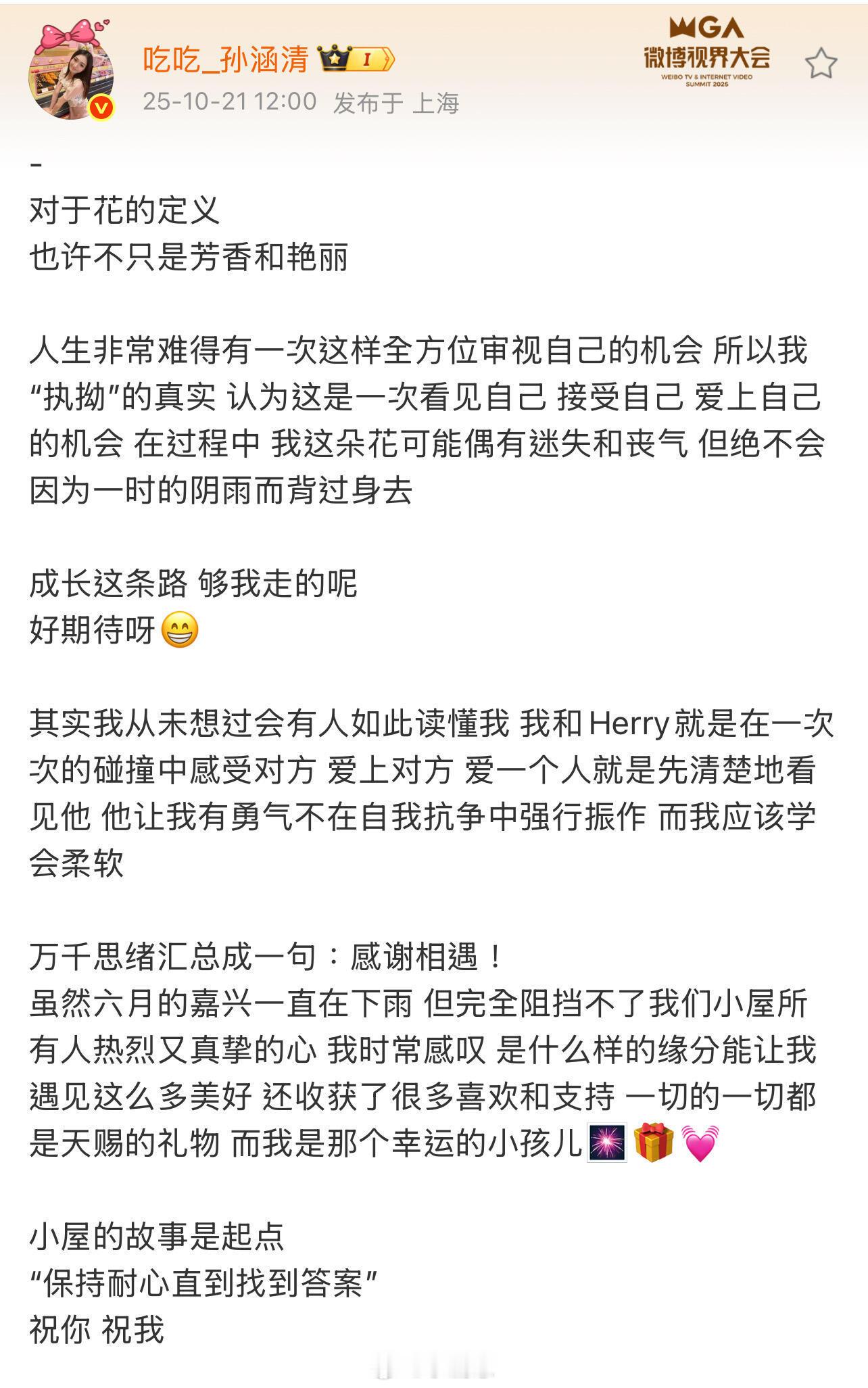 他说:【我遇到了一个立体的她,热烈、真诚、积极、阳光、勇敢的她,感染着我,带动着我,成长为更好的自己。时间会给予答案,会写出完整的我们的故事。