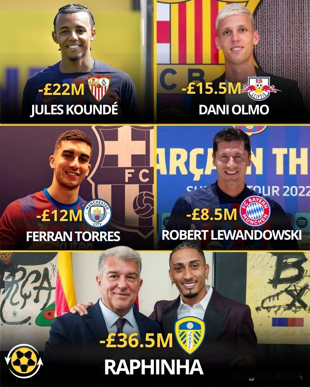 🚨巴塞罗那仍欠 1.38 亿英镑转会费,其中包括: 🔸利兹联队以3650万英镑收购拉菲尼亚 🔸塞维利亚以 2200 万英镑收购朱尔斯·孔德 🔸莱比锡红牛 1550 万英镑换来丹尼·奥尔莫 🔸曼城以 1200 万英镑收购费兰·托雷斯 🔸拜仁慕尼黑以 850 万英镑收购罗伯特·莱万多夫斯基 据报道,这家加泰罗尼亚俱乐部被告知,他们必须在本赛季结束前偿还 1.21 亿英镑的债务,以保持财务稳定。