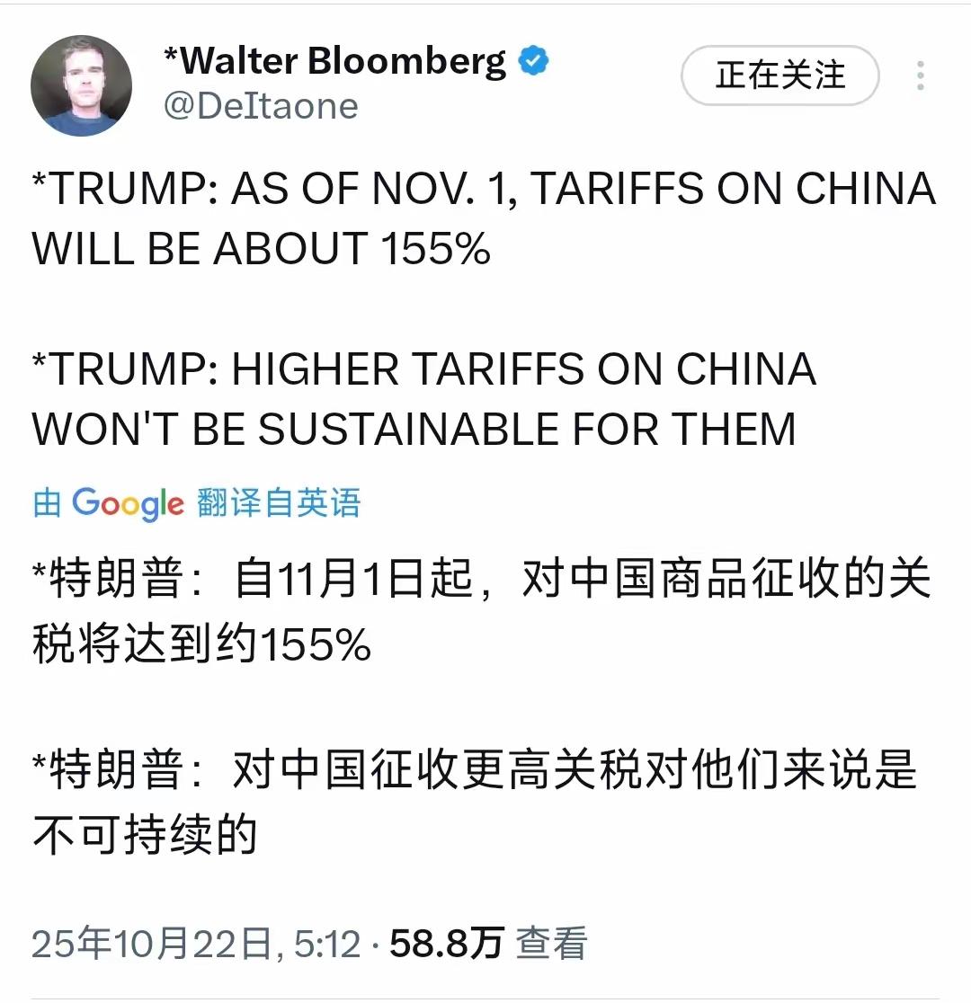 特朗普提出新话术要在下个月对华加征155%的关税又称与华关税不可持续 据特朗普总统社交媒体10月22日消息,其称要在11月1日起对华加征155%的关税,不是之前的100%关税,凭空又多出了55%的关税是用来打压股市为自己建仓吗? 随后其又发文称中美之间的关税贸易战不可持续,难道是为自己1日的政策留有后手吗?对于特朗普这个操纵股市的高手,我们在旁看其表演就好。毕竟中方两次使用稀土牌的力度是早就拿捏好了的,不怕他不乖乖就范。和中国玩谋略,老特再等几年吧!