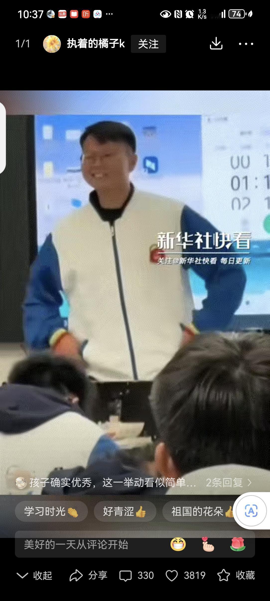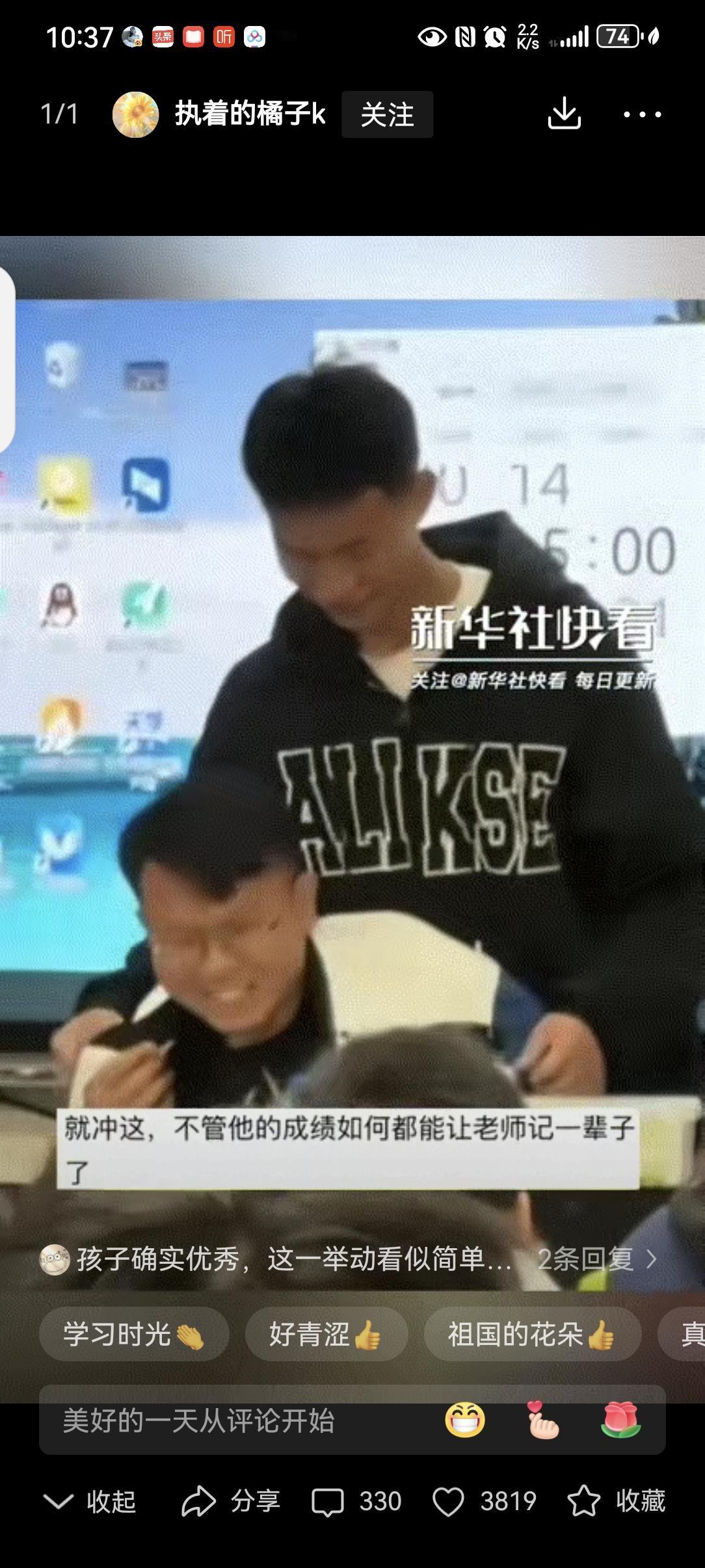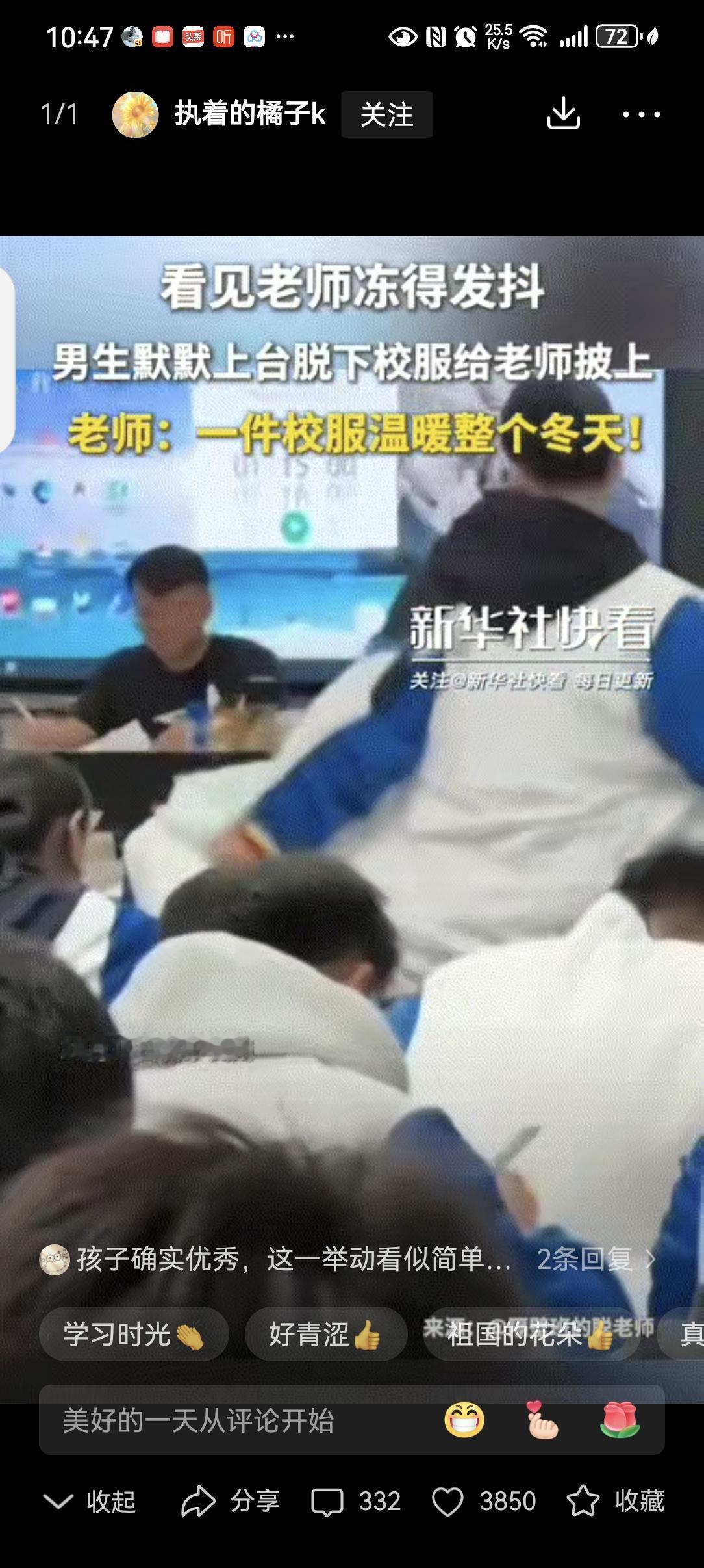 这一刻成绩已经不重要了!贵州,老师在讲台上看着学生们自习,后排一位男同学突然走上了讲台,原以为是问问题,没想到男同学竟然将自己的校服外套脱下给依旧身穿短袖的老师披上! 贵州一所学校里,老师穿着短袖坐在讲台上,看着底下学生自习。最近降温来得突然,他没来得及添衣服,身子忍不住微微发抖。 后排一个男生早就看在了眼里,他悄悄站起身,不是去问问题,而是径直走向讲台。 走到老师身边,男生二话不说,把自己的校服外套脱了下来。“老师,您穿上吧,我不冷。” 老师愣了一下,连忙摆手说不用,可男生不由分说,已经把校服轻轻披在了她肩上。 一瞬间,老师的嘴角再也绷不住,笑意从眼睛里溢了出来。教室里突然爆发出雷鸣般的掌声,比任何时候都响亮。 网友说,这件带着体温的校服,足够温暖老师一整个冬天。 其实教育哪只是教知识?这个男生没说一句大道理,却用一个动作上了最生动的一课:懂得心疼别人,学会换位思考,比任何分数都珍贵。 这份藏在校服里的温柔,是老师教出来的光,最后又照亮了老师自己,看得人心里软软的,暖暖的。