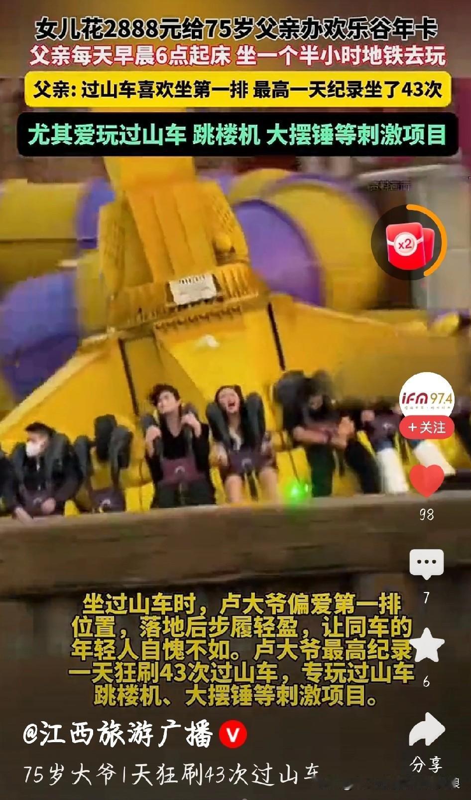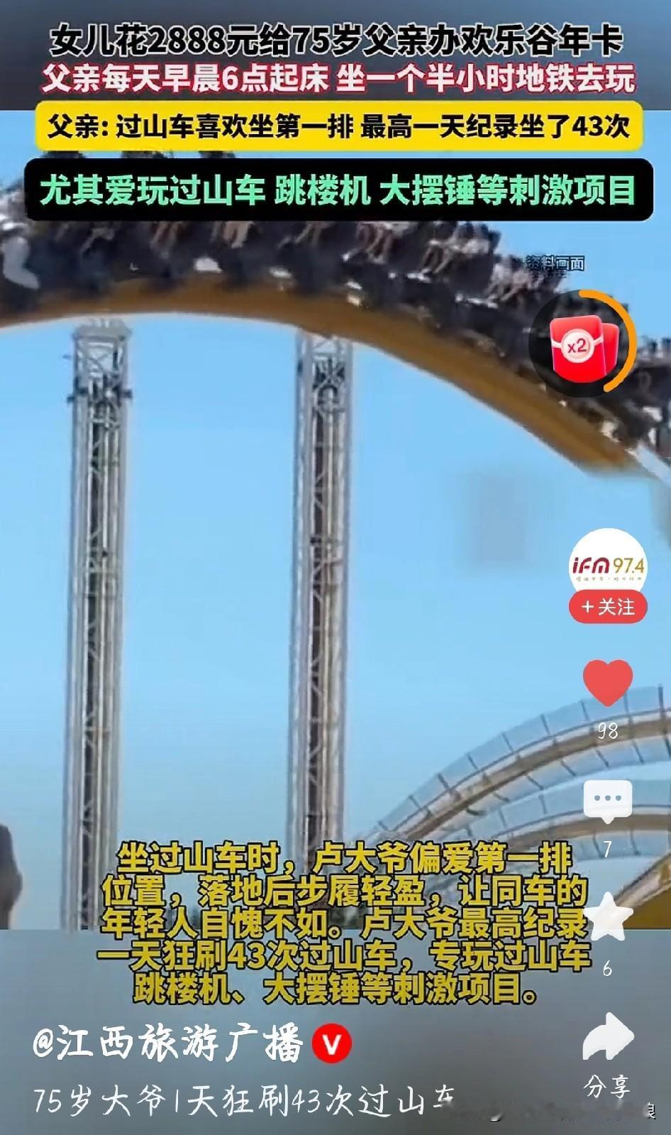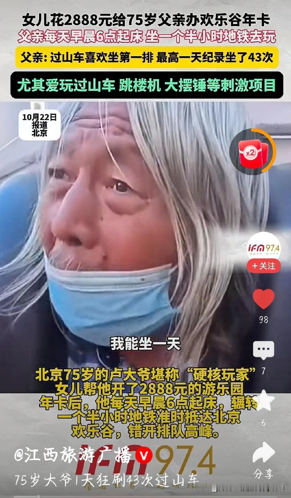 刷到北京卢大爷的事儿,我是真看呆了!75岁的年纪,一天能坐43次过山车,比咱年轻人还能造! 这大爷可不是一时兴起,人家是欢乐谷的资深玩家。每天早上6点就起床,坐一个半小时地铁赶过去,就为了错开排队高峰多玩几趟。过山车要坐第一排,16层楼高的顶点张开双臂,66秒一趟的飞翔,下来脚步比年轻人还稳,同车的小伙子都得佩服 。 更逗的是,大爷为了省时间,直接从包里掏面包边排队边吃,甚至趁工作人员不注意,在过山车上偷偷咬两口 。除了过山车,跳楼机、大摆锤这些刺激项目也没落下,女儿都支持他,特意给办了2888元的至尊年卡。 游乐园里不光他一个“银发玩家”,还有83岁的常客、爱开碰碰车的78岁奶奶,这帮老人哪是来带娃的,分明是自己当主角来了 。不过医生也说了,大爷这是个案,咱可别盲目学。 想想这状态,75岁还能追着刺激跑,比闷在家里强多了!这晚年生活,也太酷了吧?75岁大爷1天狂刷43次过山车 过山车