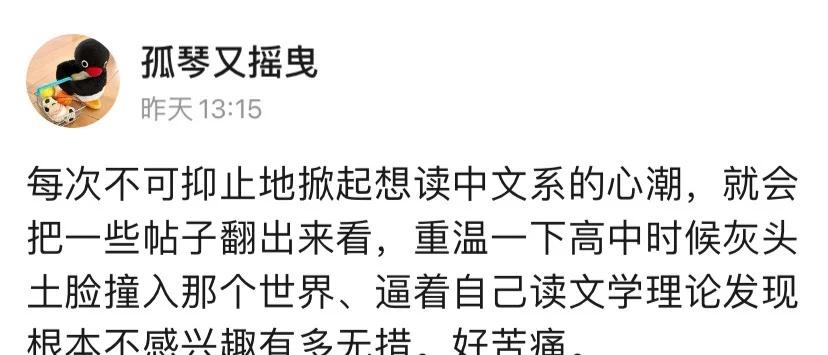 想念一些不存在的中文系 金秋跑的路线经过历史学院和中国语言学系。转院的念头如鬼魅,在这种时刻又现身又开始低语。 听太多朋友怨忿过,说文学院多么磋磨人,你爱的不会是它的所有,你不要让它挤占你生活的所有。 再稍年轻些的时候,大学在我头脑里只有唯一一个概念,无比具象无比美丽,皖师湖边,桃红簇拥柳绿,柳也是金色的,湖水也是金色的。直到十一月末的时节,在回宿舍的路上,仍然可以闻到桂花的气味。皖师,皖师。一定读文学。 朋友甚至说那留下深深的创伤。很难讲文学院到底带给她们什么,又无情地拿走多少代价。唉。我们爱的不存在的中文系。明知道明知道。 中文系