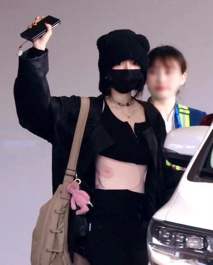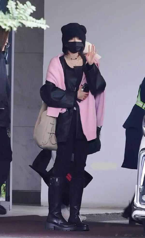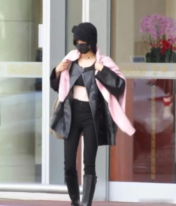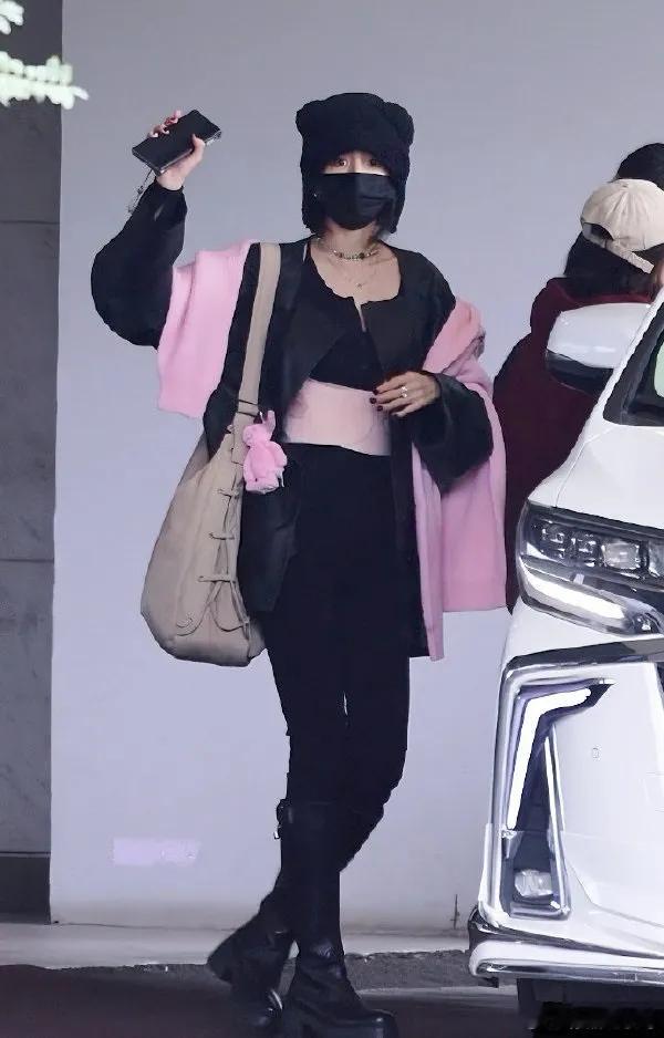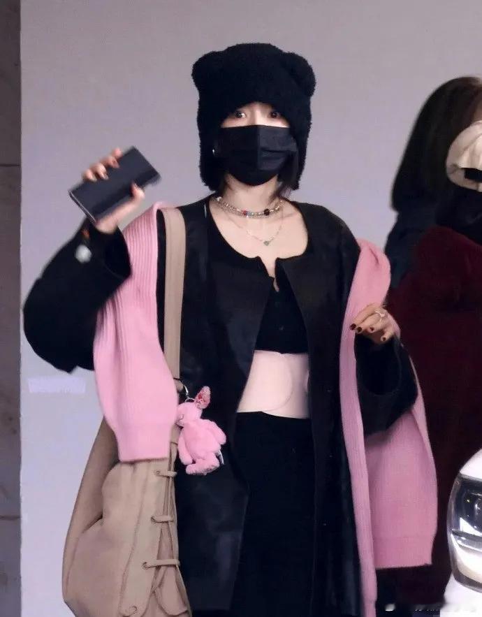 杨幂现身上海机场,黑短背心配黑紧身裤秀纤腰好比例,黑靴添干练,黑外套披粉色卫衣显洒脱,身材苗条高挑有活力,黑帽口罩藏神秘,潮流又年轻。