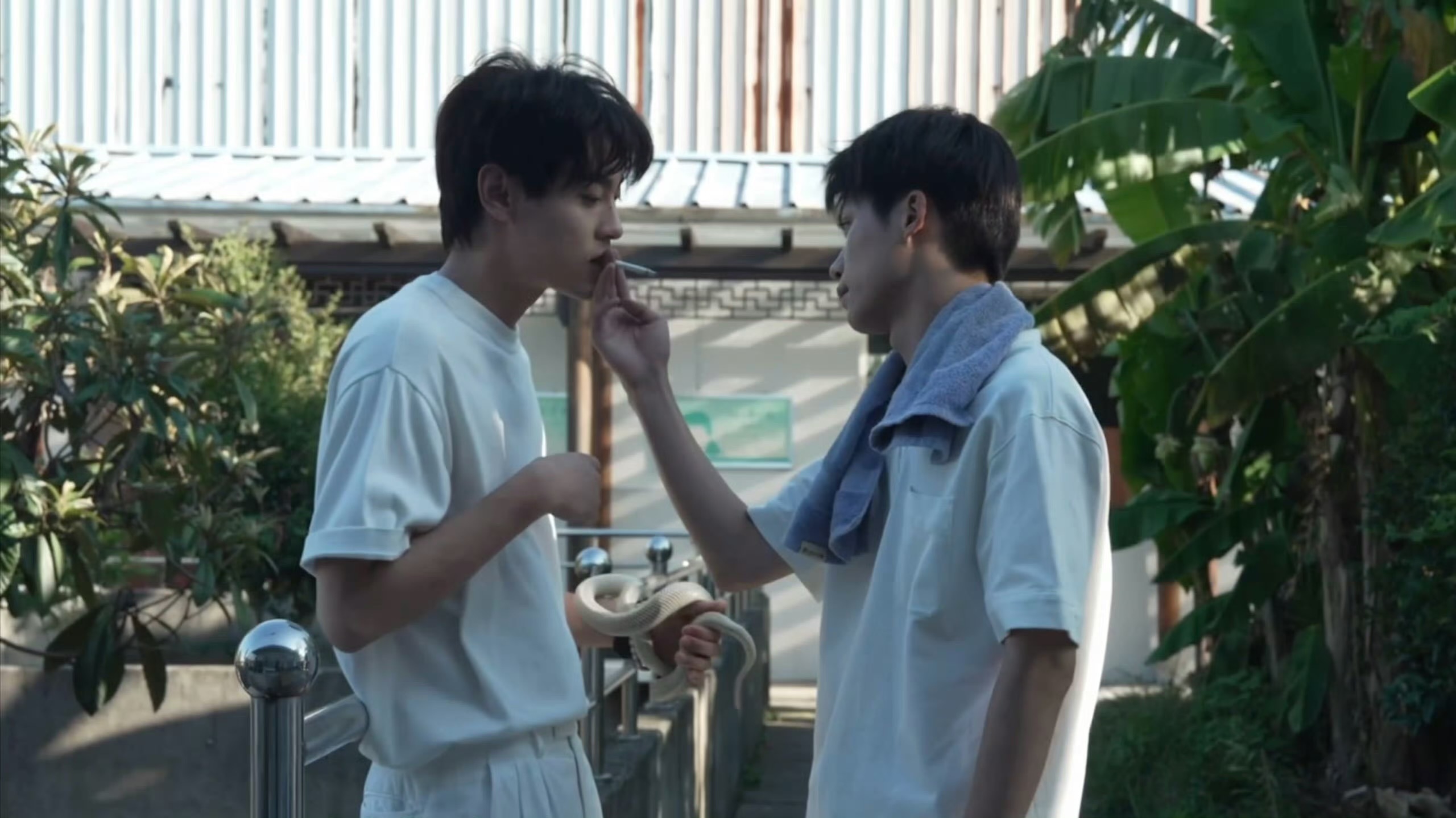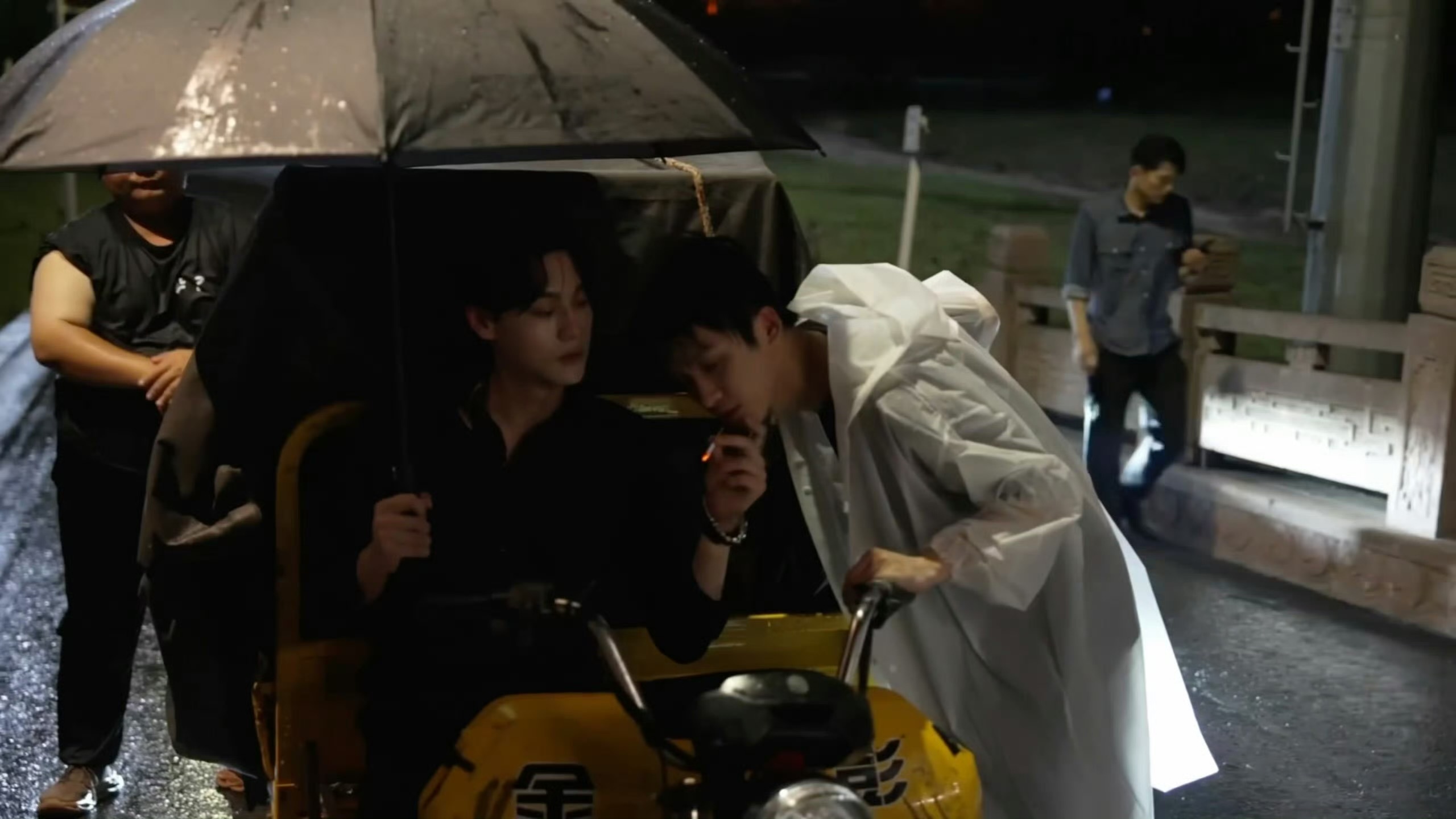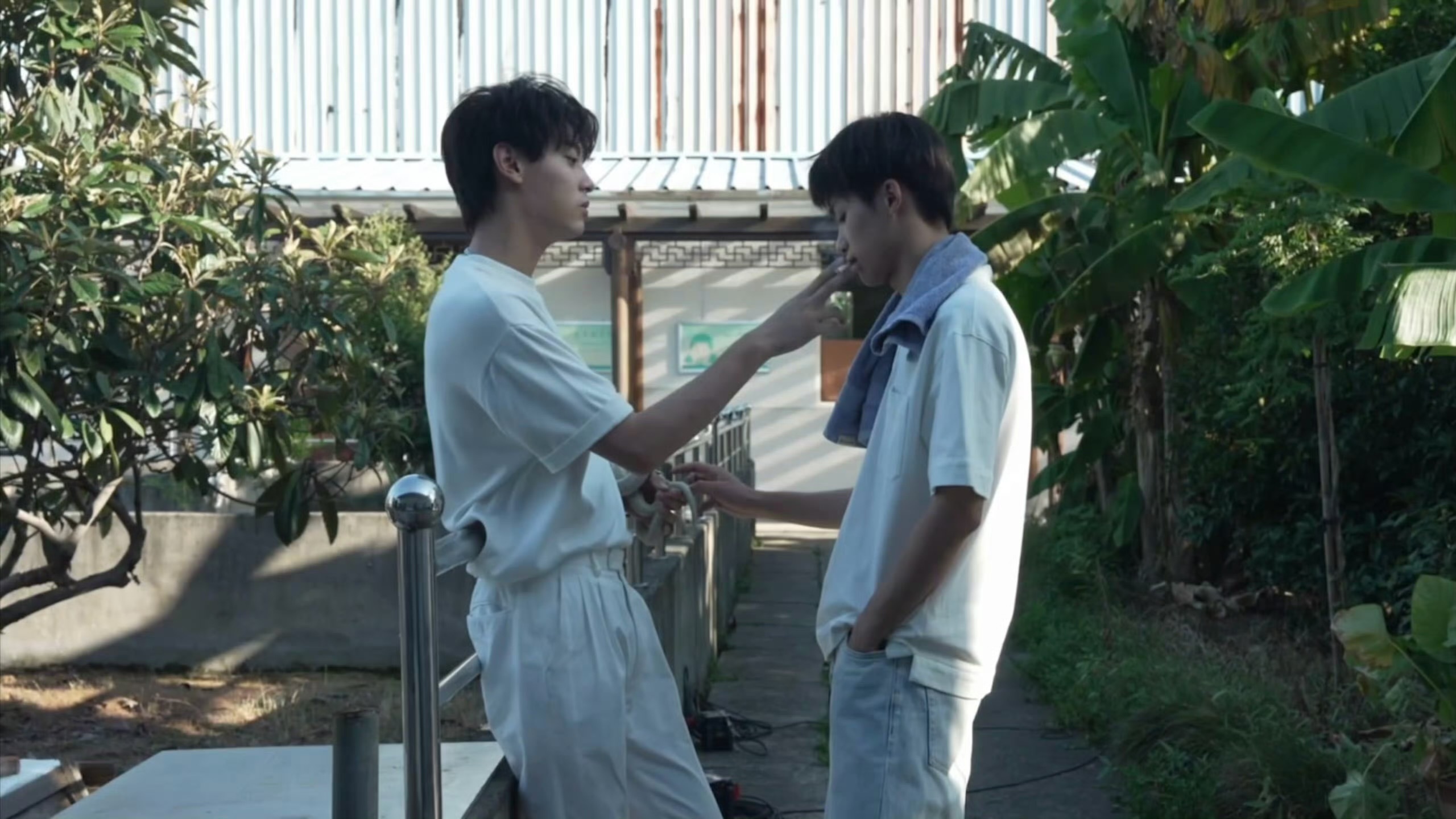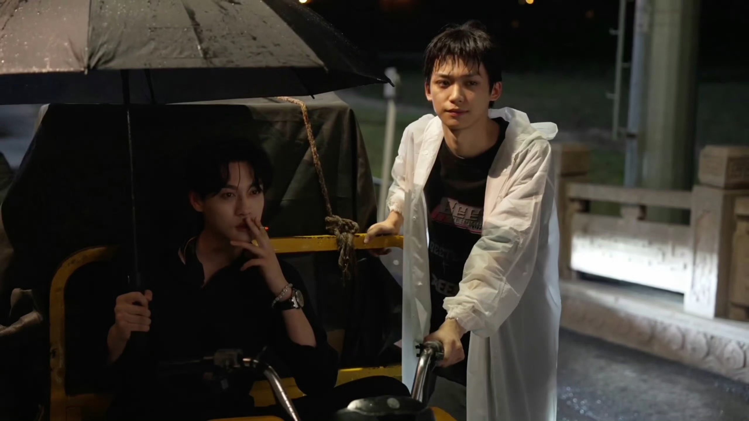 田雷往凳子上一坐发现真的很晒,立刻起立帮小孩儿挡阳光