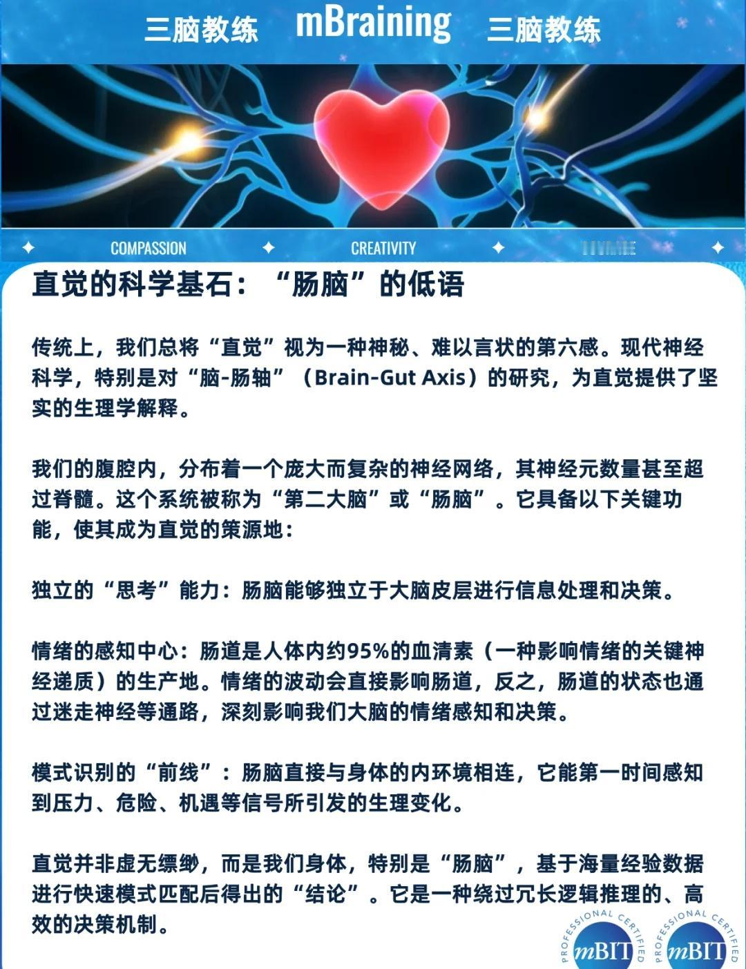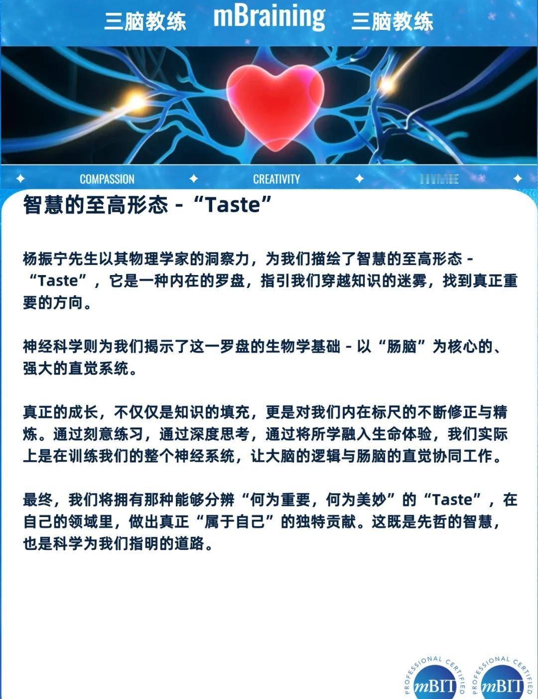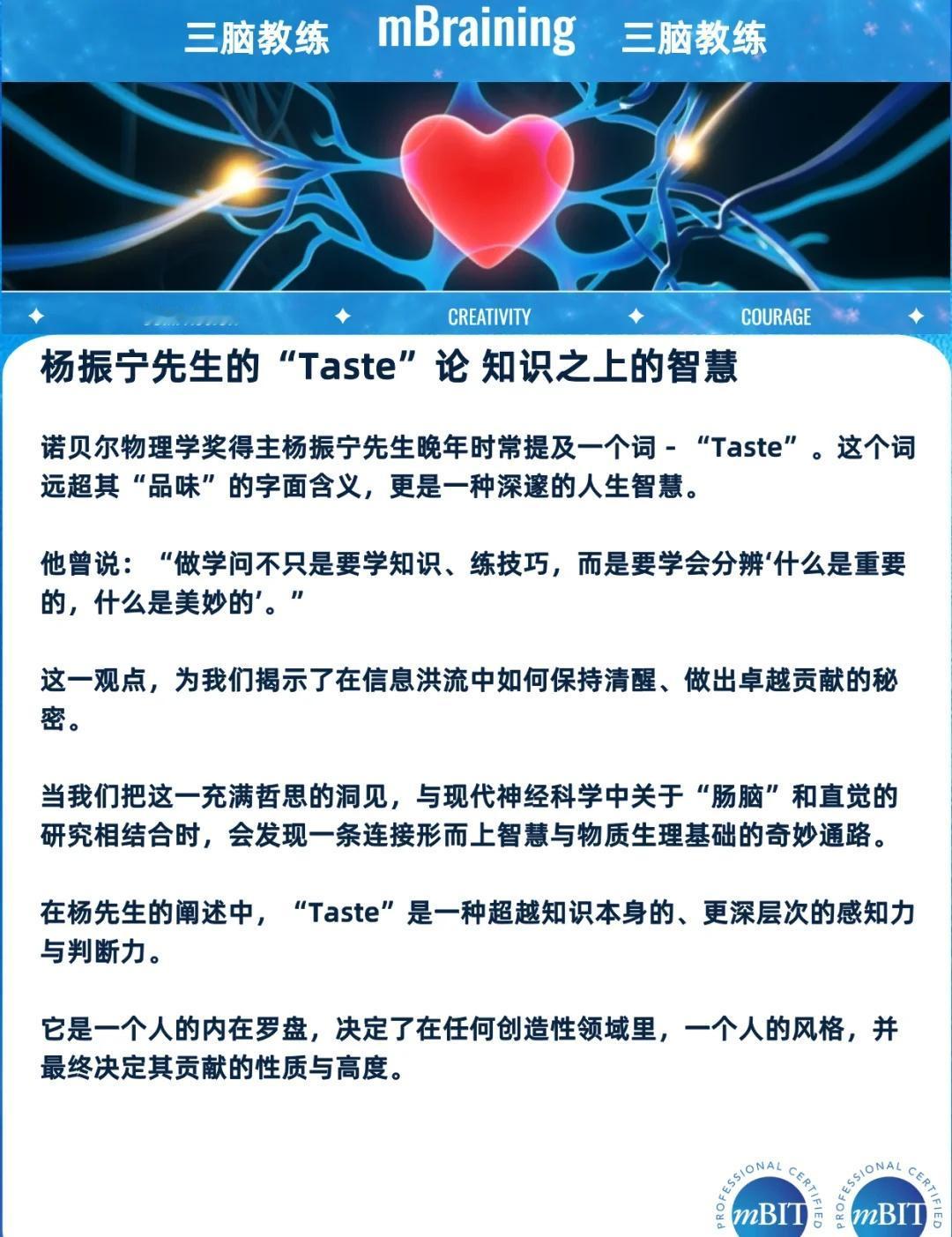杨振宁的“天机” 顶级的“Taste”竟和肠脑有关 杨振宁先生晚年常提及一个词 - “Taste”,远超“品味”的字面含义,是一种深邃的智慧。当我们与神经学中关于“肠脑”和直觉的研究结合,会发现一条连接形而上智慧与生理基础的奇妙通路。 "Taste”是知识之上的智慧 Taste是一种超越知识本身的深层次感知力与判断力,体现在: 价值判断的直觉:面对复杂问题,凭直觉抓住核心,识别出"美妙的”部分。 深度学习的标志:真正的学习不是知识堆砌,而是将新知内化,成为“校准过的直觉”。 自我确立的基石:“读书人没有自己的taste,我们很容易被知识本身淹没。” 直觉的科学基石:“肠脑”的低语 被视为神秘的“直觉”,在现代神经科学中找到了坚实的生理学解释,尤其是对“脑-肠轴”的研究。腹腔内分布着庞大而复杂的神经网络,被称为“第二大脑”,具备成为直觉策源地的关键功能: 独立的“思考”能力:肠脑独立于大脑皮层进行信息处理。 情绪的感知中心:肠道生产了人体约95%的情绪关键递质—血清素,肠道的状态影响大脑的情绪感知和决策。 模式识别的“前线”:肠脑能第一时间感知压力、机遇等信号引发的生理变化。 合二为一:用“肠脑”的智慧,淬炼人生的“Taste” 将杨振宁先生的“Taste”与“肠脑”理论结合后的清晰成长路径: 杨先生所说的“学习就是校准直觉”,本质是利用大脑皮层~逻辑脑所学的新知识、新经验,不断“训练”和“校准”肠脑的直觉系统。 初学者的直觉是未经校准的,拥有“Taste”的专家,已将该领域的知识与审美深度内化到了整个神经系统中。 当他面对新问题时,"肠脑”会首先根据过往经验给出强烈的直觉信号,"这个方向是重要的”、“这个解法是美妙的”。这个信号就是他“Taste”的体现。随后,他的大脑皮层会用严谨的逻辑去验证和阐述这个直觉。 这个过程如杨先生所说,“想不通就要想通,才能举一反三”。这个“想通”的过程,就是用理性思考去打磨和验证直觉。最终达到的“举一反三”,是直觉系统被成功“校准”后,灵活、准确地做出判断的境界。 杨振宁先生为我们描绘了智慧的至高形态 -“Taste”,指引我们穿越知识迷雾的内在罗盘。神经学则揭示了这一罗盘的生物学基础—以“肠脑”为核心的强大直觉系统。 杨振宁 杨振宁逝世 直觉 教练 NLP