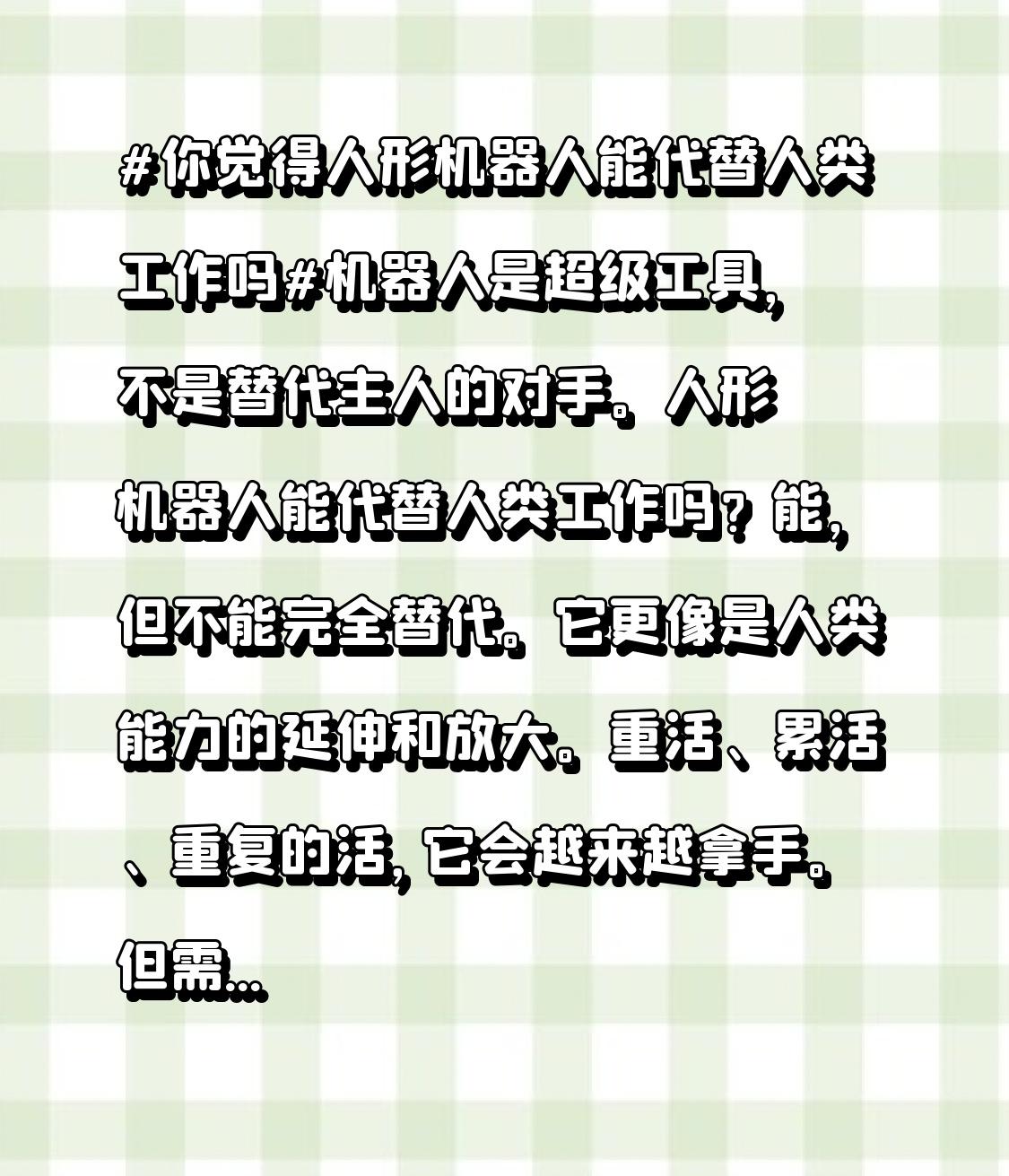 人形机器人能代替人类工作吗?能,但不能完全替代。它更像是人类能力的延伸和放大。重活、累活、重复的活,它会越来越拿手。但需要人情味、创造力和复杂决策的工作,它暂时还不行。关键在于,我们怎么用它。 从特斯拉到富士康,机器人已上岗。 看看现实世界。特斯拉的“擎天柱”机器人,目标是进工厂干那些枯燥的装配活。富士康的生产线上,早已有机器人手臂在精准地焊接零件。这些不是科幻片。它们能24小时工作,不出错,不喊累。 但这背后是什么?是工程师设计了它,是程序员编码了它,是维护员保养着它。机器人把工人从繁重的岗位解放出来,但也催生了新的、技术含量更高的岗位。它不是简单抢走饭碗,而是改变了饭碗的样子。 人机协作是未来,终身学习是出路。 所以,别恐慌。历史告诉我们,每次技术革命都会淘汰旧岗位,创造新岗位。核心不是“会不会被取代”,而是“我们准备好了吗”。 未来已来。与其担心被机器人取代,不如想想如何驾驭它。把机器人当同事,让它处理数据,我们来做决策;让它执行命令,我们来搞创新。提升自己,学习新技能,这才是面对机器人时代最聪明的态度。 你怎么看?欢迎在评论区聊聊你的想法!