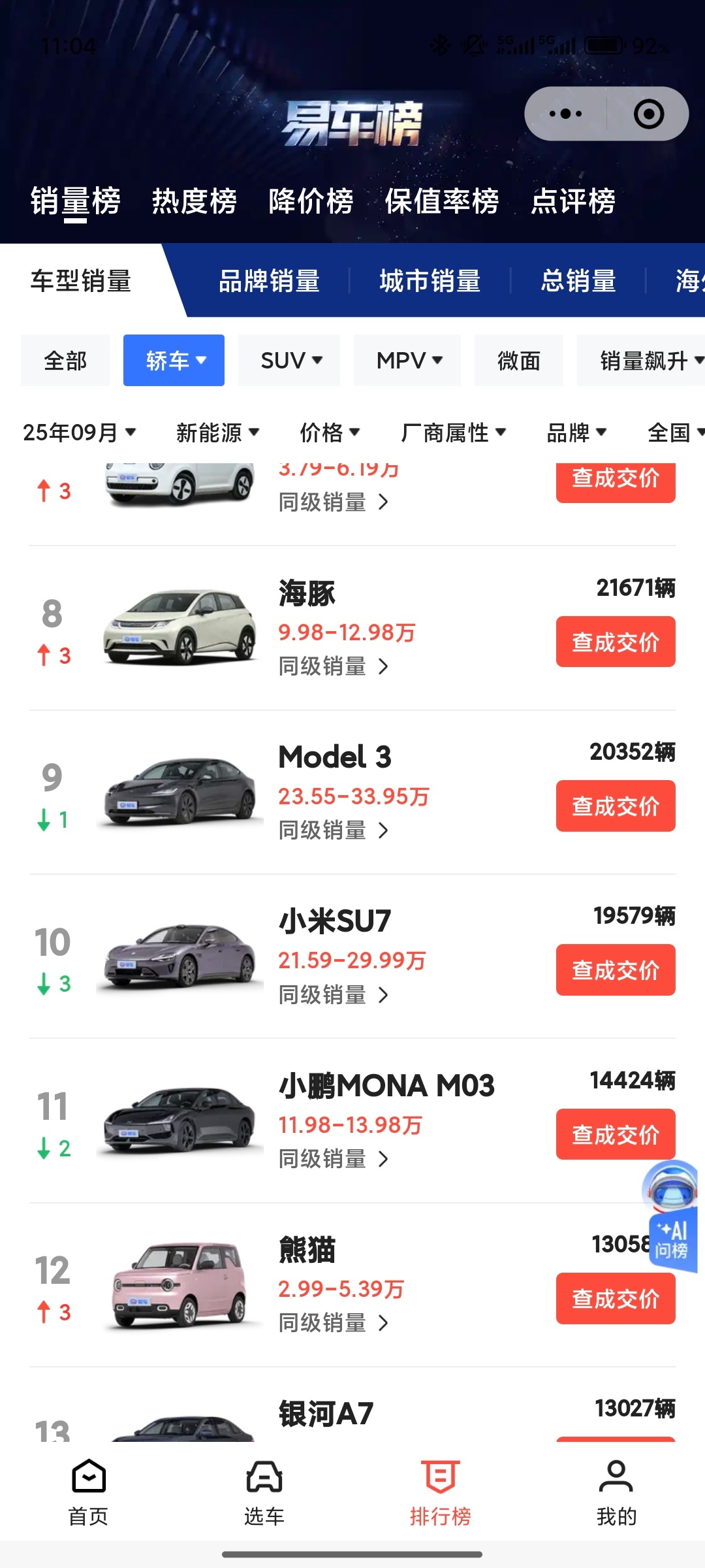 而9月份的数据,特斯拉Model3反超小米SU7,差异也不大。