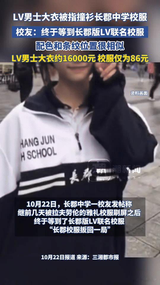 万元LV大衣撞衫86元中学校服,校友:这波“联名”赢麻了! 你能想象吗?万元的LV男士大衣,居然和湖南长郡中学的校服“撞衫”了! 10月22日,长郡中学校友发帖调侃,自家校服和LV一款男士大衣配色、条纹位置高度相似。一边是约16000元的奢侈品牌大衣,一边是仅售86元的中学校服,价格悬殊却“撞脸”,让校友直呼“终于等到长郡版LV联名校服”。 网友也跟着热闹起来,有人调侃“长沙四大名校还剩两个,留给奢牌的时间不多了”,还有人好奇“长郡校服会不会涨价”。这种接地气的“撞衫”,属实给大家整了个意外的乐子。