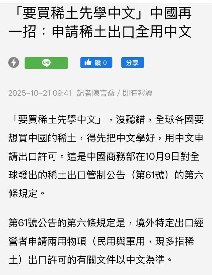 转发一条商务部出台的关于申请稀土的文书要求 购买稀土申请书的行文标准:中文,WPS格式。 这回明白了为什么英语会成为世界通用语言。 二百多年前,他们就是拿着枪顶着你的脑袋,告诉你必须说什么话,用什么语言,守什么规矩。 把野蛮粉饰成了文明,把屠杀美化成维护秩序,把殖民化妆成商业规则。 现如今,咱们是礼仪之邦,公告事项就温柔多了:目的是省掉外语翻译的麻烦,避免语言不同产生误解。 当然,申请书一切以提交的中文表述为准。