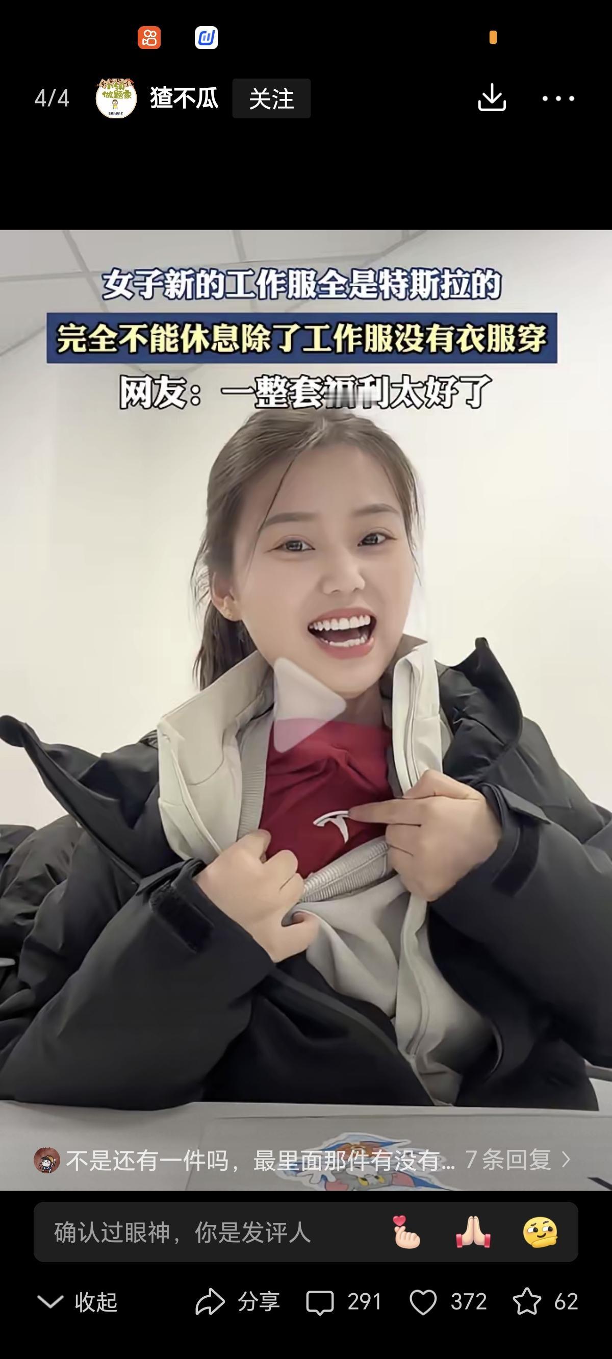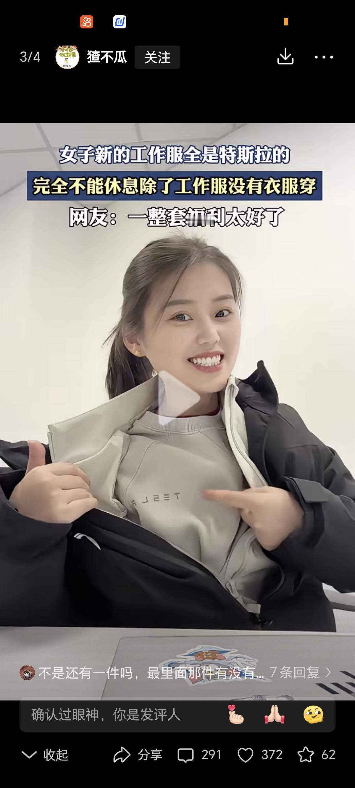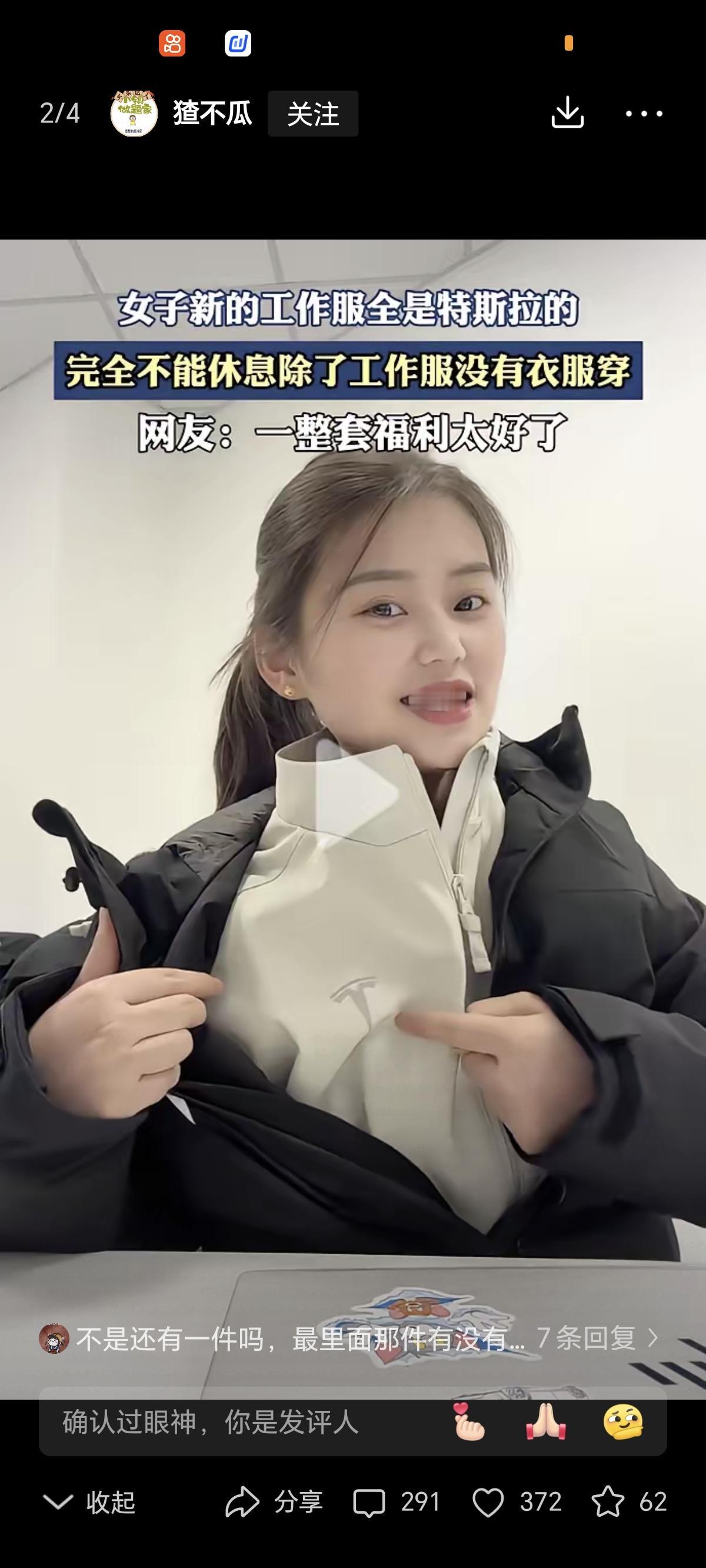 “特斯拉员工真是太惨了!” 10月22日,一名女员工晒出了特斯拉的工作服,女子先是指着自己的羽绒服上的标志说:“特斯拉!” 然后拉开羽绒服,露出里面的米色外套,女子指着标志说:“还是特斯拉!” 接着,女子继续拉开外套,里面是一件米色的卫衣,女子指着标志说:“又是特斯拉!” 最后,女子从领口拽出最里面的一件红色秋衣,指着标志说:“还有特斯拉!” 从最外面的羽绒服,到最里面的秋衣,所有的衣服都是特斯拉,特斯拉这是把员工所有的衣服都包了啊!而且看衣服的面料、材质、和款式都是非常有质感,非常帅气! 有网友调侃说:“特斯拉员工太惨了,完全不能休息,因为除了工作服没有衣服穿了!” 这可不是随便发的衣服,特斯拉明确把免费工装纳入员工福利,从外层羽绒服到内层秋衣,覆盖全季节穿搭,面料多采用63%棉+37%聚酯纤维的弹力材质,兼顾舒适与挺括,和网上调侃的“没衣服穿”恰恰相反,是实打实的福利升级。 不止特斯拉,蔚来等同类企业也有类似操作,员工常晒出全套企业工服,特斯拉工服更细分场景,比如钣喷中心的速干抗污套装、行政岗的反光条POLO衫,既满足工作需求,又省去员工置装开支,这种定制化工装已经成了大厂福利的标配。 看似调侃的“惨”,本质是企业福利的具象化体现。比起传统企业敷衍的工装,特斯拉用有质感、分场景的全套服饰,既强化了品牌认同,又切实解决了员工穿搭需求,打破了“工装=廉价”的刻板印象,是企业与员工双赢的细节设计。