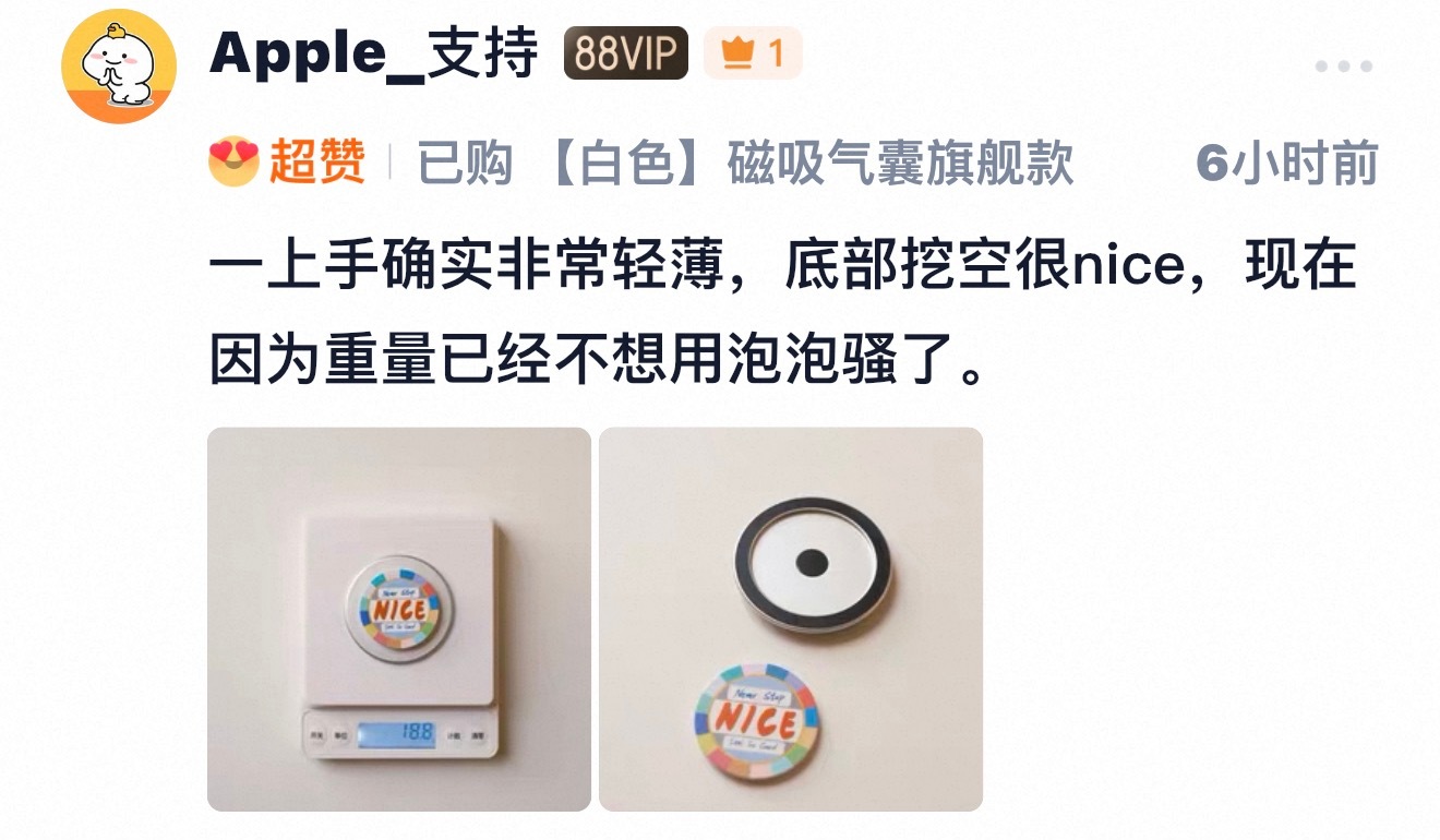 很有质感的晒单实拍图,感谢喜欢和支持旗舰款磁吸气囊[嘻嘻]铝合金一体纯平底座,搭配无棱气囊,手感触感都很 nice。底部减轻设计,每天时刻用着的磁吸配件,每减 1 克,都是在给使用体验持续加分[yeah]