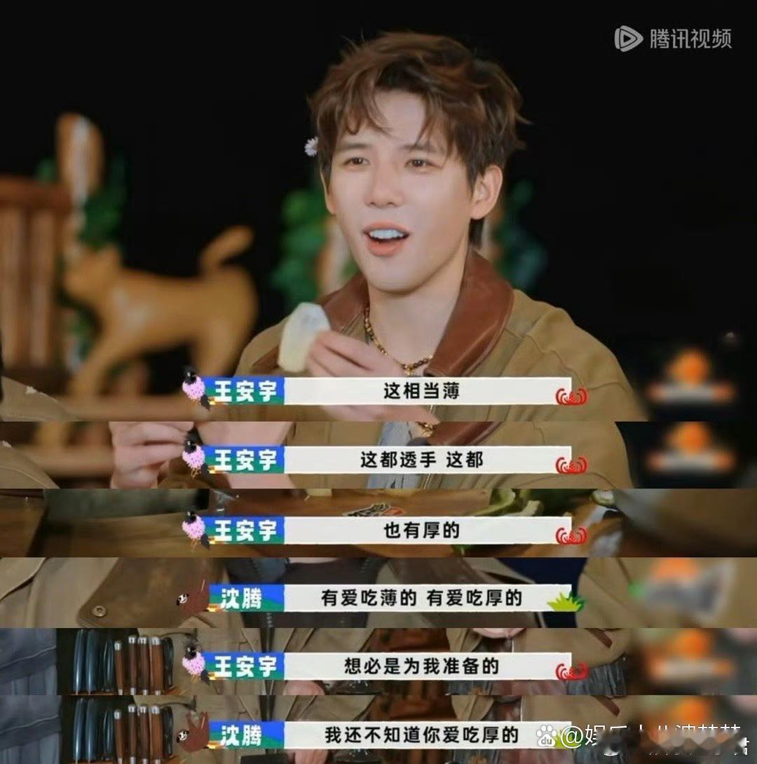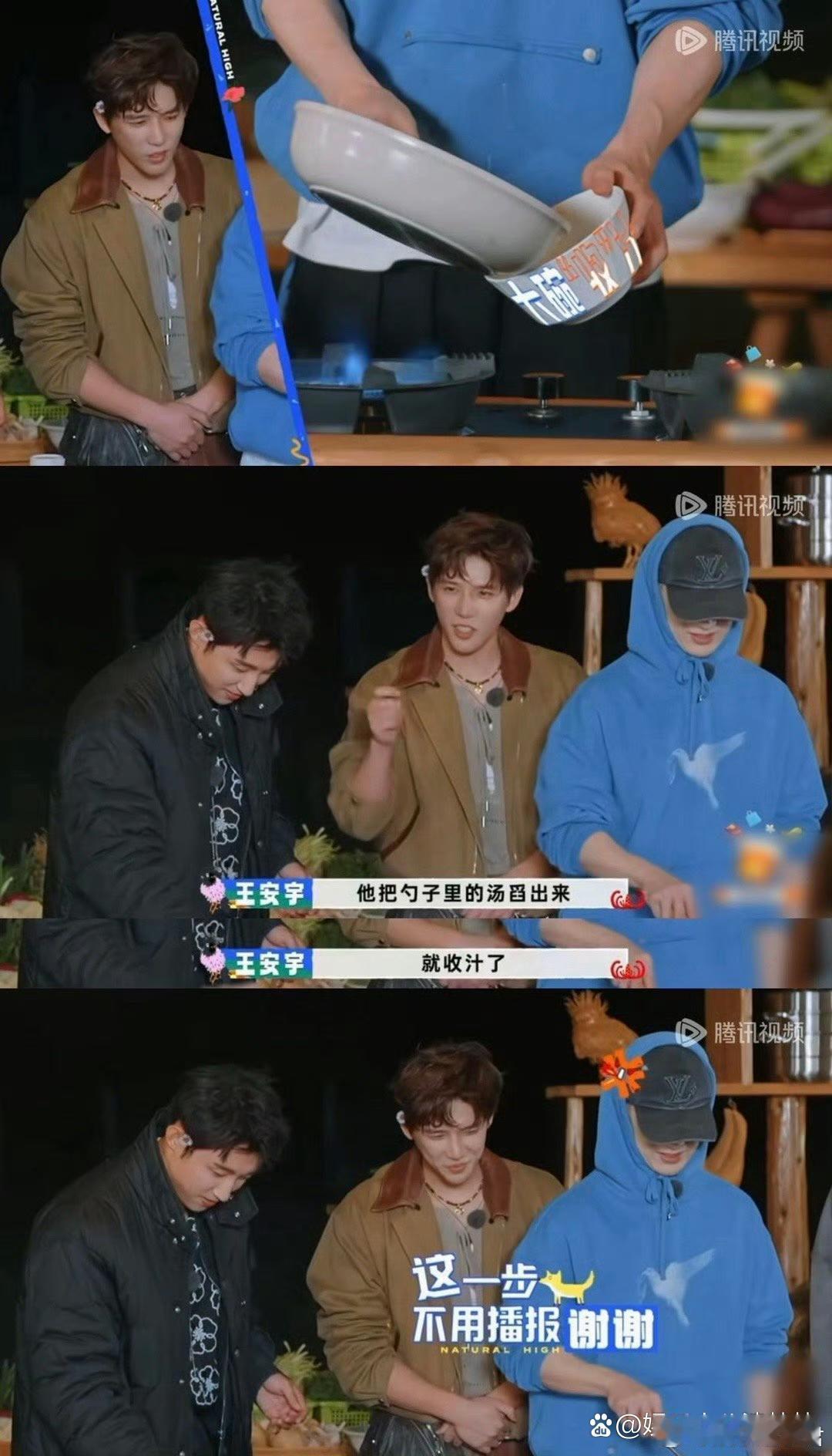 王安宇这“碎嘴”真的太让人稀罕了,主打一个不仅看破还说破。白敬亭切青椒不小心掉了,他零帧“告发”浪费青椒半根。白敬亭做菜收汁,王安宇看到即说出,“他把勺子里的汤舀出来就收汁了!”而且这张嘴也没有放过腾哥,上一秒夸土豆切的薄都透光,下一秒就对着镜头说有厚的,甚至还提醒镜头给腾哥特写,哈哈哈哈~简直了,