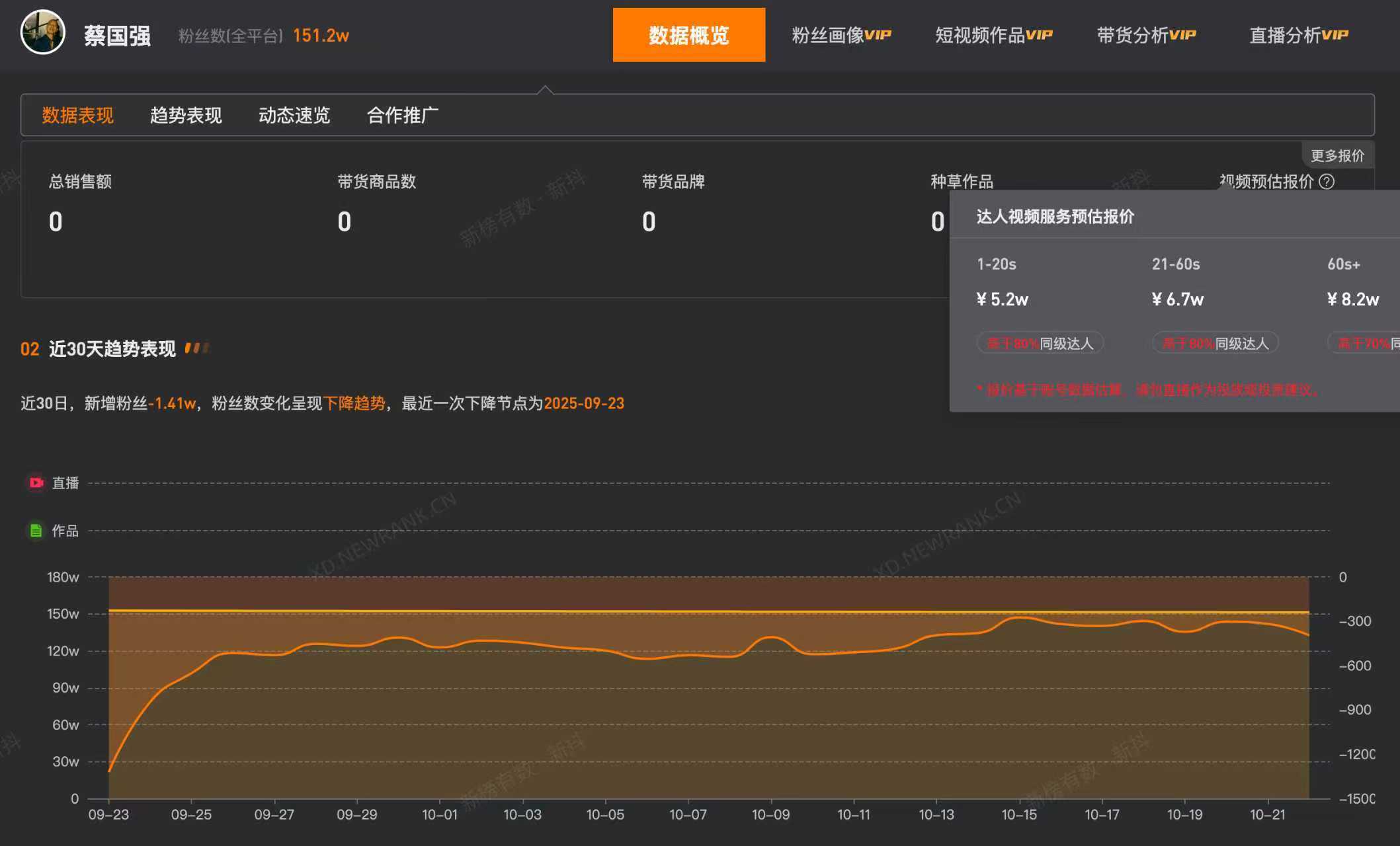 第三方数据显示,蔡国强视频平台近30日掉粉超1.41万。此外,其1-20s视频广告报价为5.2万,21-60s视频广告报价为6.7万,60s以上视频广告报价为8.2万。