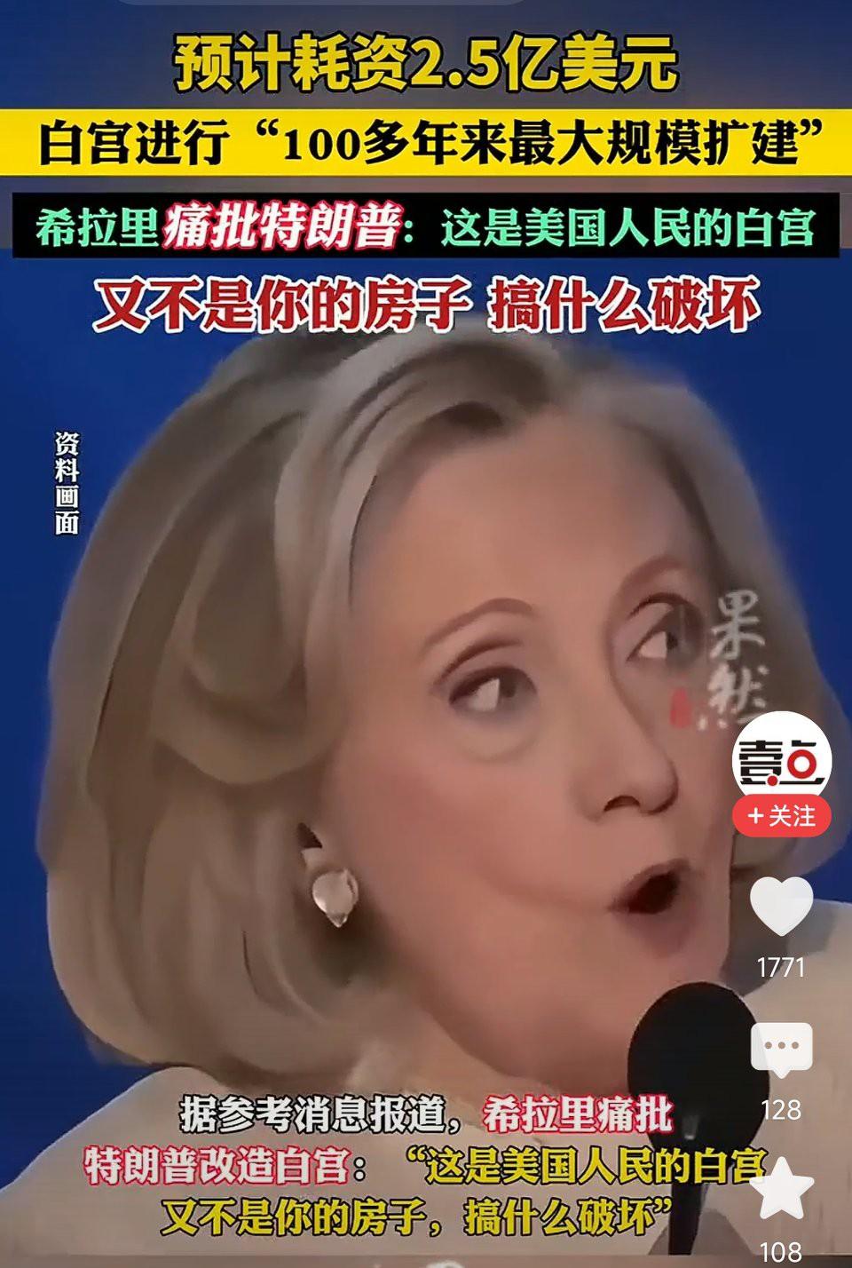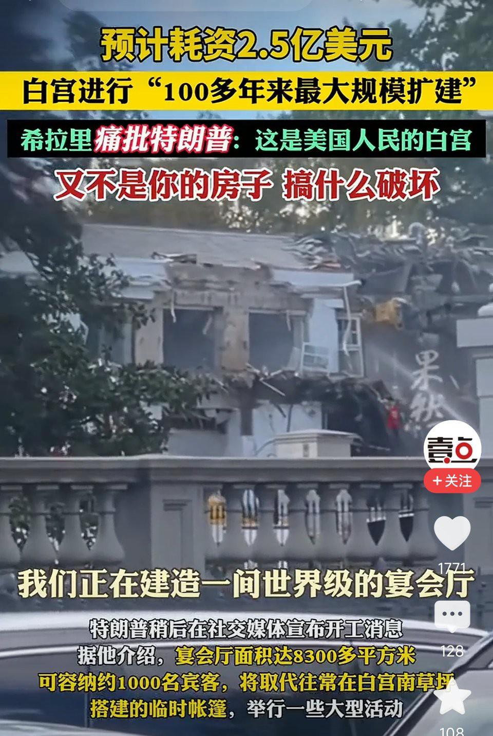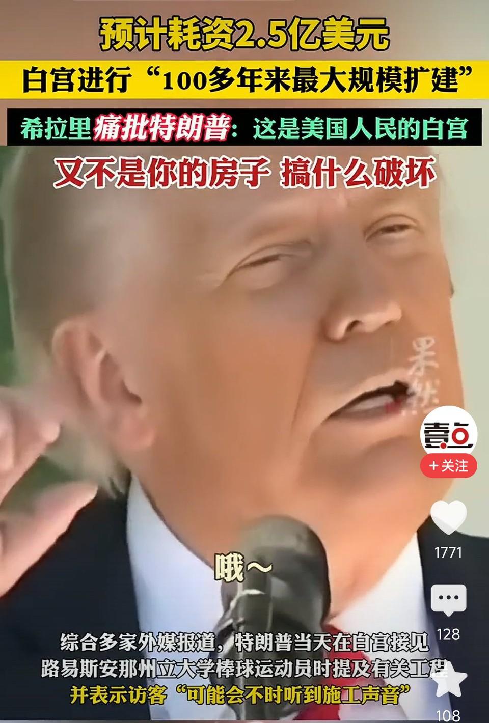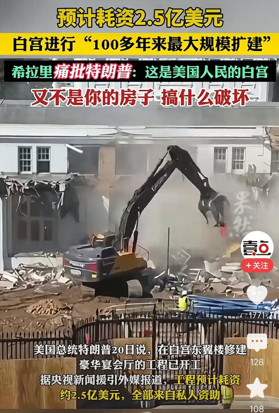特朗普对白宫进行“100多年来最大规模扩建”!希拉里痛批特朗普:这是美国人民的白宫,又不是你的房子,搞什么破坏! 网友表示: 特朗普上台,目的只有一个,重塑美国,并在美国留下深深的特朗普烙印。 不愧是开发商出身,也有可能是美国历史上第一个被判入狱的。 川普:下一步,我要用金箔把白宫变成黄宫! 前线百万美军断薪,你到好修起娱乐会所,这种国家离内部叛乱不远了! 军队公职人员工资都发不出,现在整这?特是一点不给四年后的自己留退路呀! 其实我觉得老太太说的对,至少他是美国的一个象征,不过以后又有一个新的版本了! 特朗普:谁再跟我竞选,我让他没地方办公! 别的都先别说,2.5亿美金修个宴会厅,还不用付征地费用,重建和白宫也用不了这么多啊! 你说美丽国欠外债36万亿,它还有钱修房子,印炒机没坏大量的印,在全球收割韭菜。 川普正在打破老美的一切规则、底线! 川普特朗普