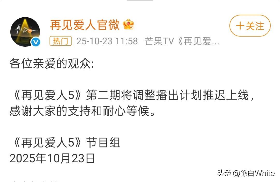 10月23日,🥭一味要流量不背调的后果就是,节目一个接着一个的被下架! 年初有赵露思的《小小的勇气》停播到现在,《许我耀眼》热播后,观众呼吁了一个月也播不出来,未来大概率也很难再播出了! 现在又有邓莎老公的《再见爱人5》前几天就有消息说会停播,很多人都不信,直到今天出消息了,才感觉历史在重演,只是这次大概率不会停播半年,毕竟邓莎老公其中嘉宾之一,有问题删了他,还有其他两对能看! 🥭现在势头确实不如三大,但也不能操之过急,该审核的一定要严格审核,无论是人还是内容,赵露思就是因为内容被坑惨了