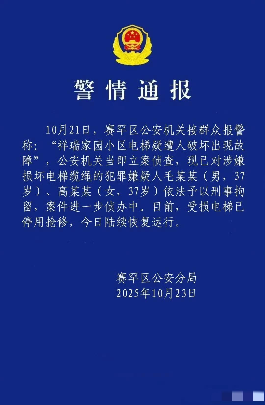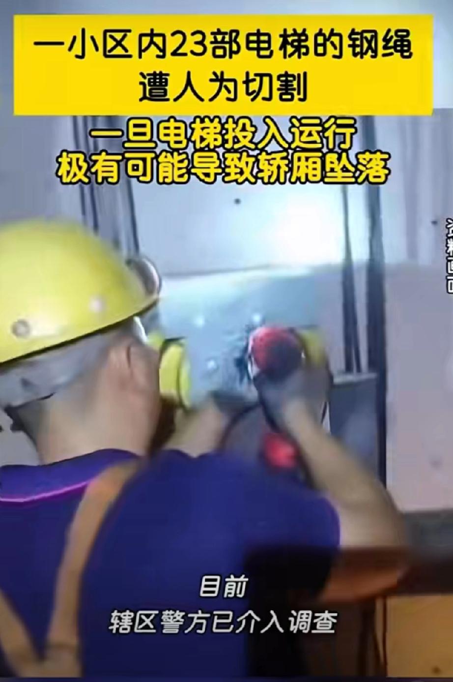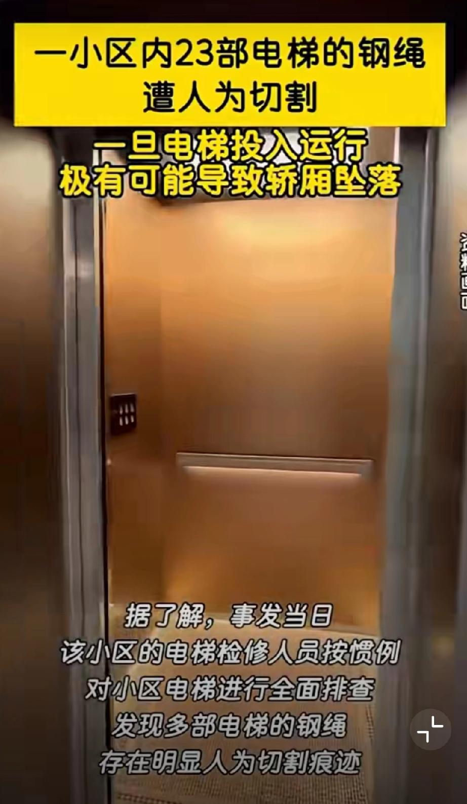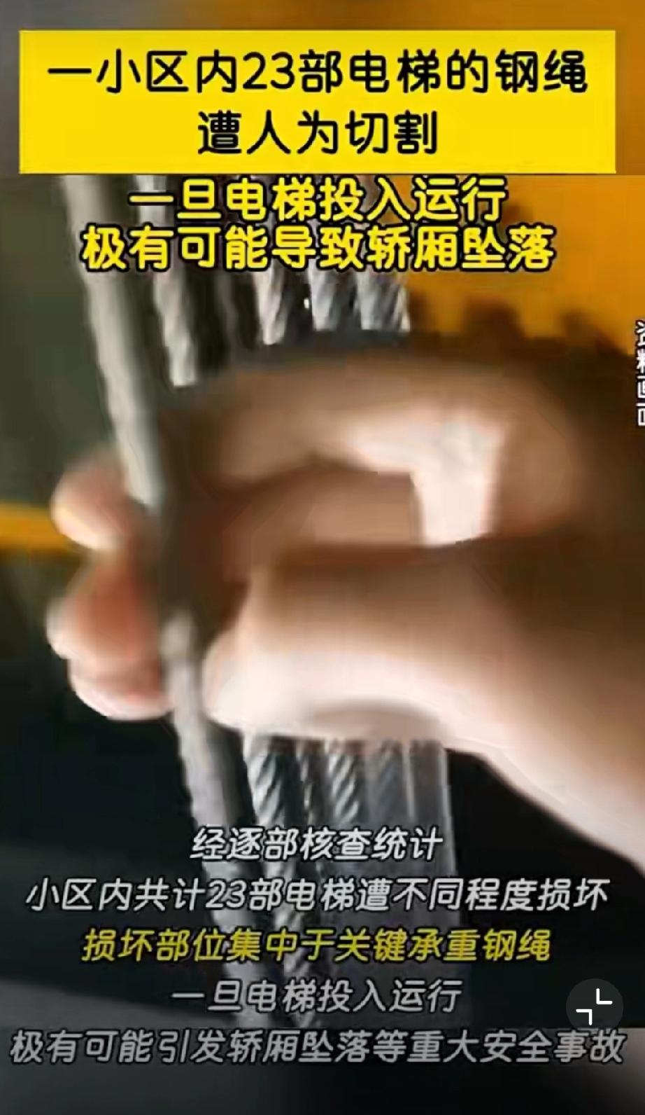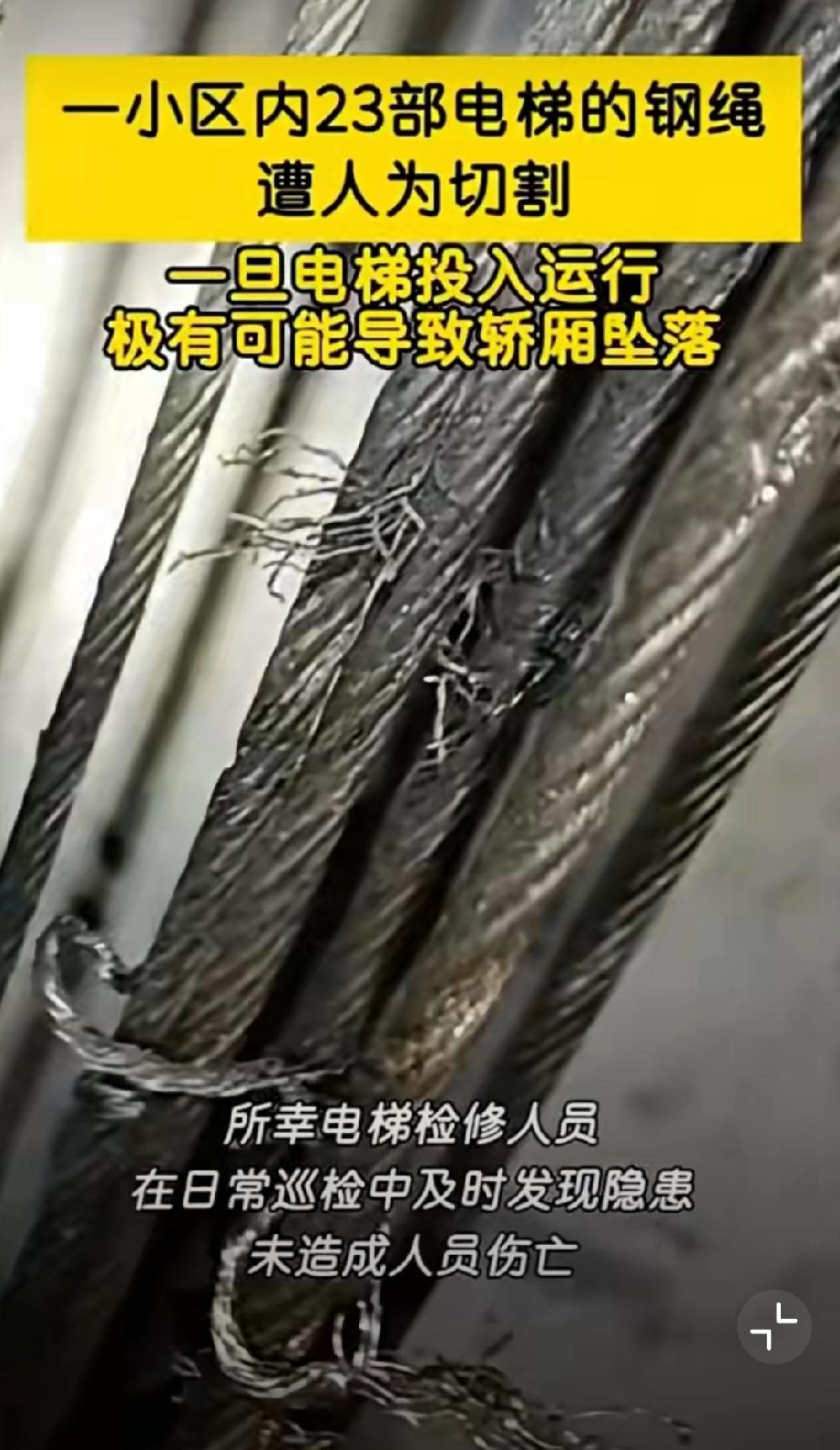 内蒙古一小区23部电梯钢绳遭人为切割,小区共50部电梯切了23部,维修人员及时发现隐患,未造成人员伤亡,目前2名嫌疑人已被刑拘。 大面积损坏电梯承重钢绳极其罕见,性质非常恶劣,涉嫌以危险方法危害公共安全罪电梯伤人 电梯钢缆 内蒙古电梯