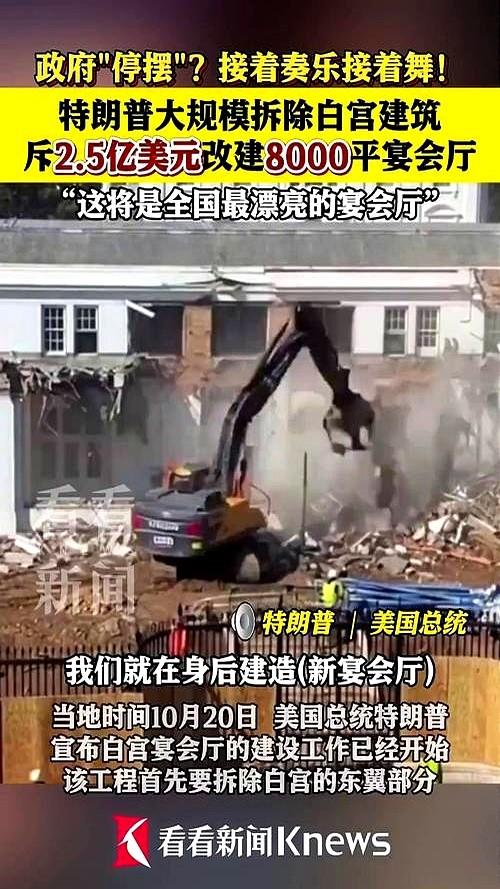 白宫东边那几栋老房子,说拆就拆了。 机器轰隆,砖瓦飞溅。 你猜咋的?2.5亿美金,眨眼就砸下去了不是政府掏,是爱国富豪自掏腰包。 你懂那种感觉吗?就是你下岗了,房贷压得喘不过气,他却在后院盖私人赛马场。 不是一次,是137次。 我当年在酒泉见过老一辈搞两弹一星的时候,连铅笔都要省着用,图纸背面写计算,饭票换零件。 现在呢?人家白宫搞宴会厅,比咱们搞火箭还讲究排面。 总统喜欢翻新?放屁!翻新是修漏雨的屋顶,这不是翻新,这是往祖宗屋里镶金边! 民主党骂他疯了。 白宫回怼那是精神错乱的左派,假新闻。 呵,人家可是民主灯塔,连拆迁都带私人资本赋能光环。 你知道什么叫卡脖子吗?我们被技术卡,他们被钱包卡只不过,卡的是老百姓的饭碗。 我不是说不该有好地方。 我当年在空军,熬夜改雷达参数,饿了啃冷馒头,没人喊苦。 可你告诉我,为什么白宫的宴会厅能叫爱国工程,而咱们修个地铁还要全民众筹? 你敢信?钱从哪儿来?特朗普自己基金、私人企业,还有慷慨的爱国者。 我猜下一步,隔壁国宴厅要装激光投影,总统一挥手,牛排自己飞上桌。 不是我不明白,这世界变化快从前是人民当家,现在是资本主政。 我老了,不想骂人。 但每回看到白宫那张宴会厅效果图,我就想起早年在西北戈壁,老班长蹲在沙坑里,指着图纸说这玩意儿,得保命的。 现在呢?保的,是几千人的饭局。 空调制冷要3000千瓦,宴会厅地板是进口大理石 你问我气不气? 气。 但更气的是,没人问一句 这钱,能不能用来修修那些漏雨的退伍军人医院? 炸了。修了。再炸。 老祖宗的墙,比不上一场镀金晚宴。 你说,我们当年拼命守的,到底是个啥?