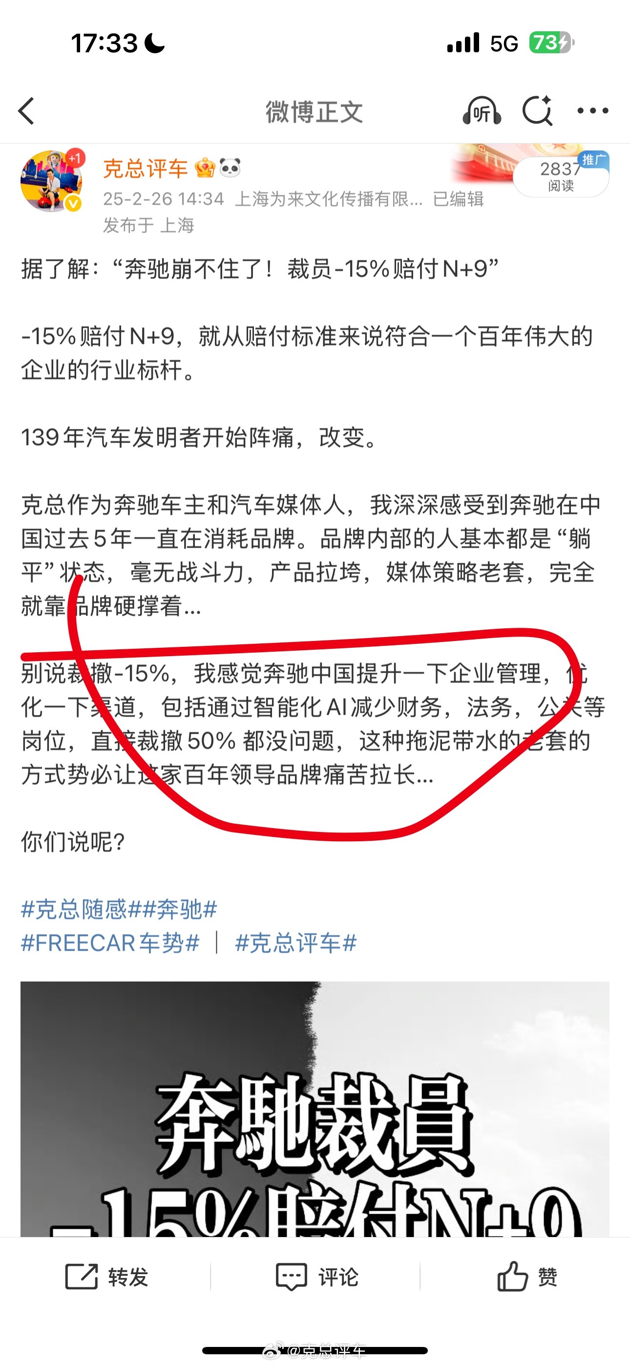 克总:年初奔驰裁员我就说过,奔驰年初裁员15%只是开胃菜!就当前局面,未来趋势奔驰裁员50%都可以,据克总观察,最近5年奔驰中国内部过于腐朽,产品跟不上,完全是在消耗这个百年品牌,不过关键变革时期能够消耗也是品牌的实力体现。