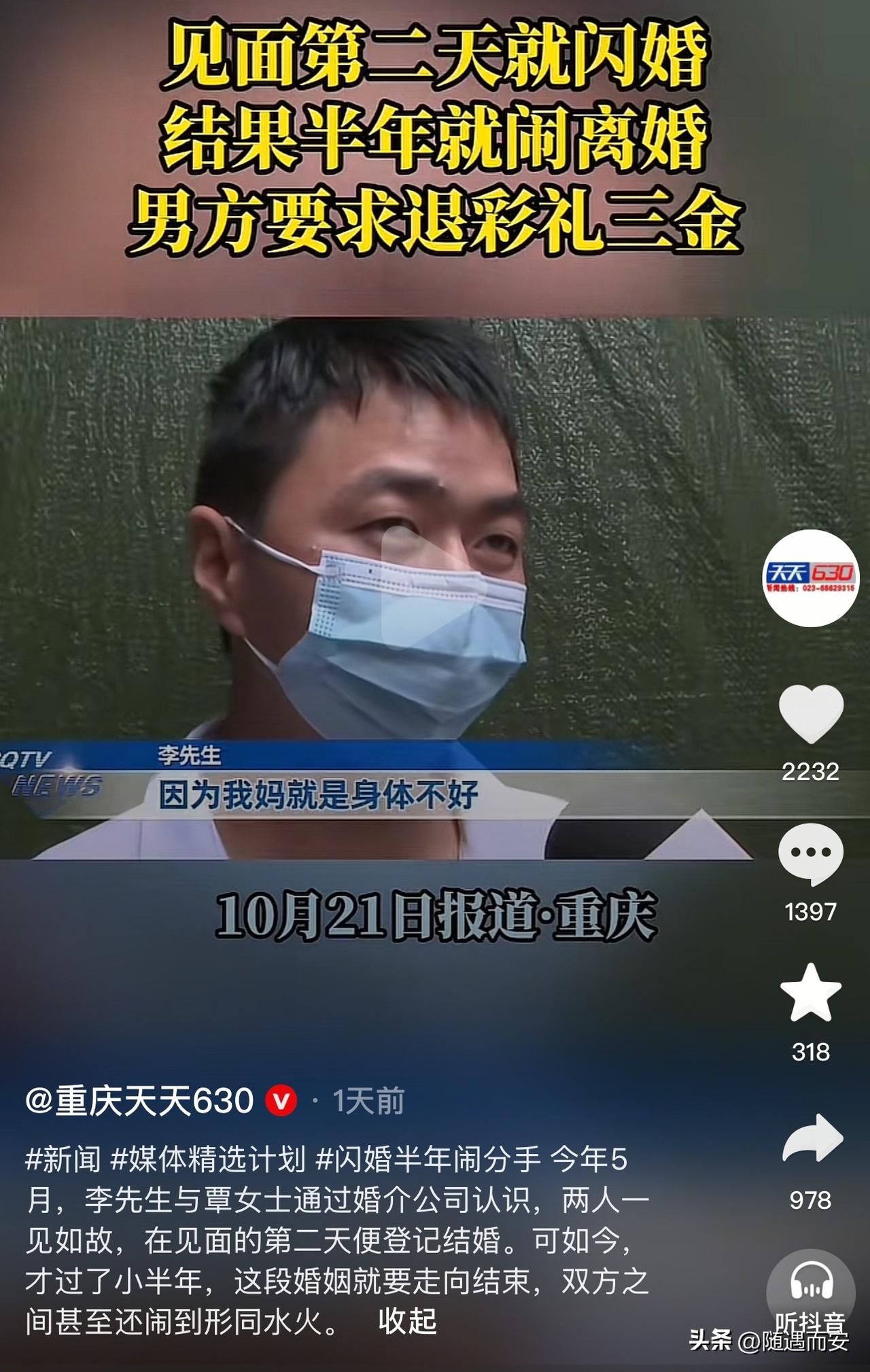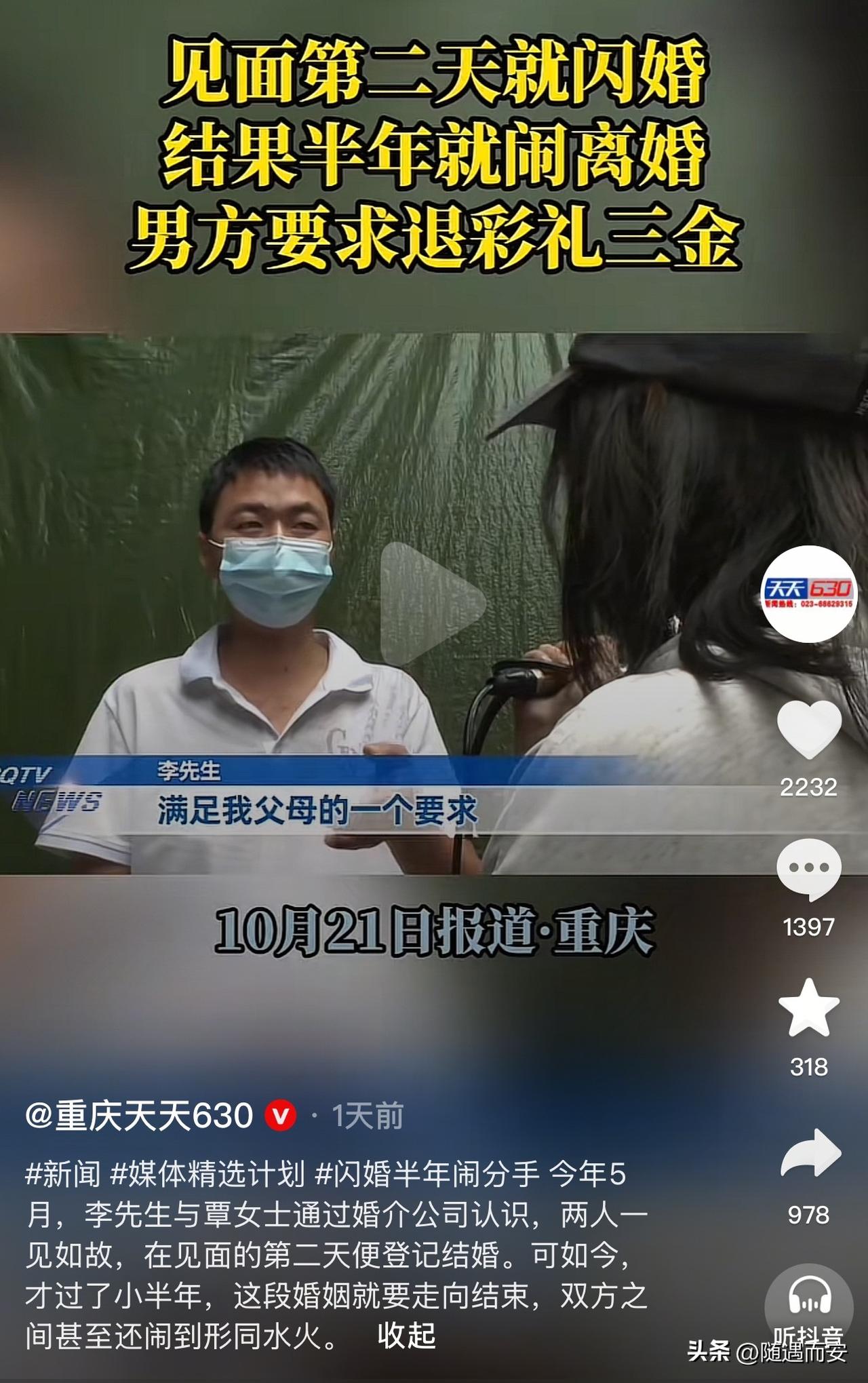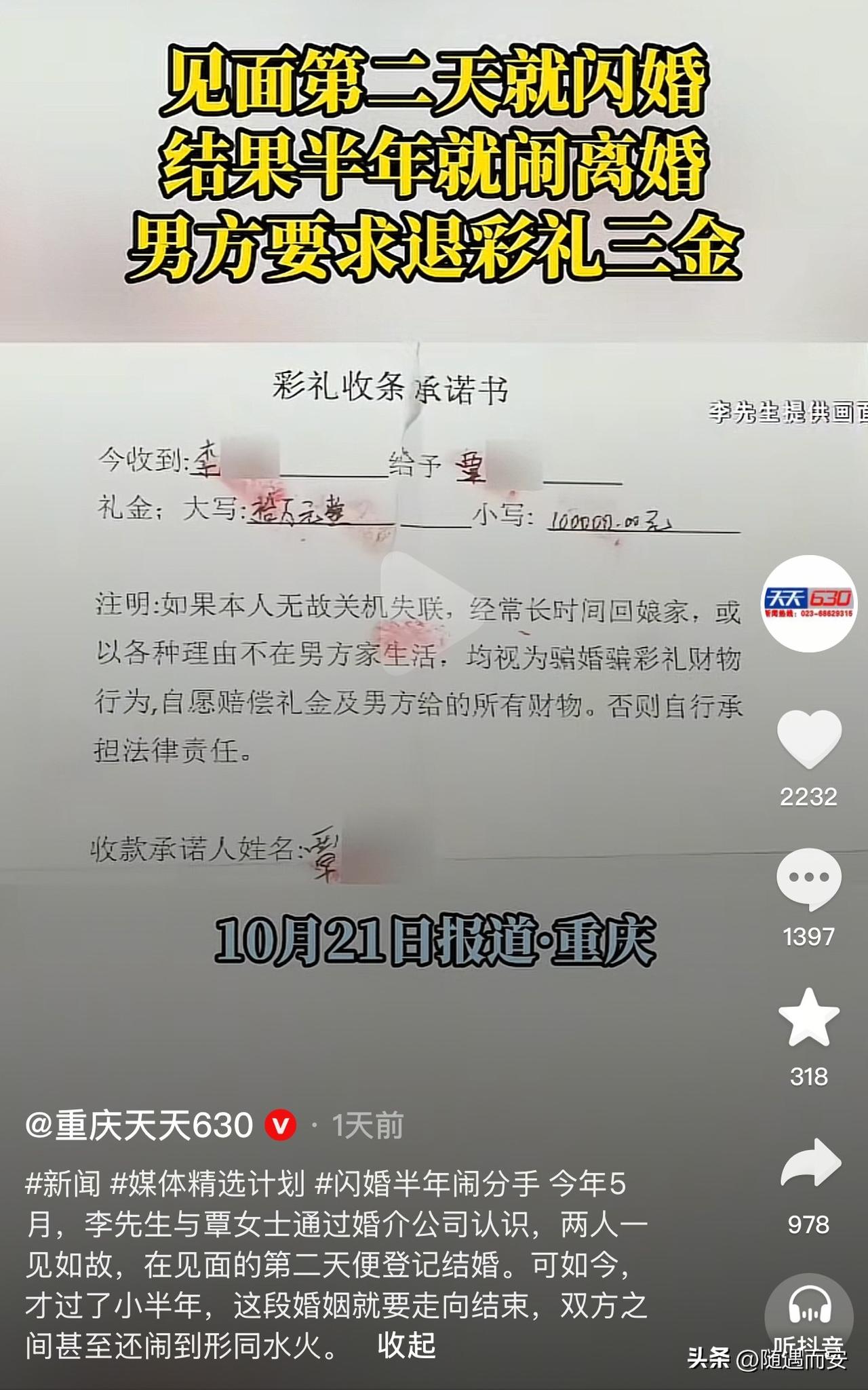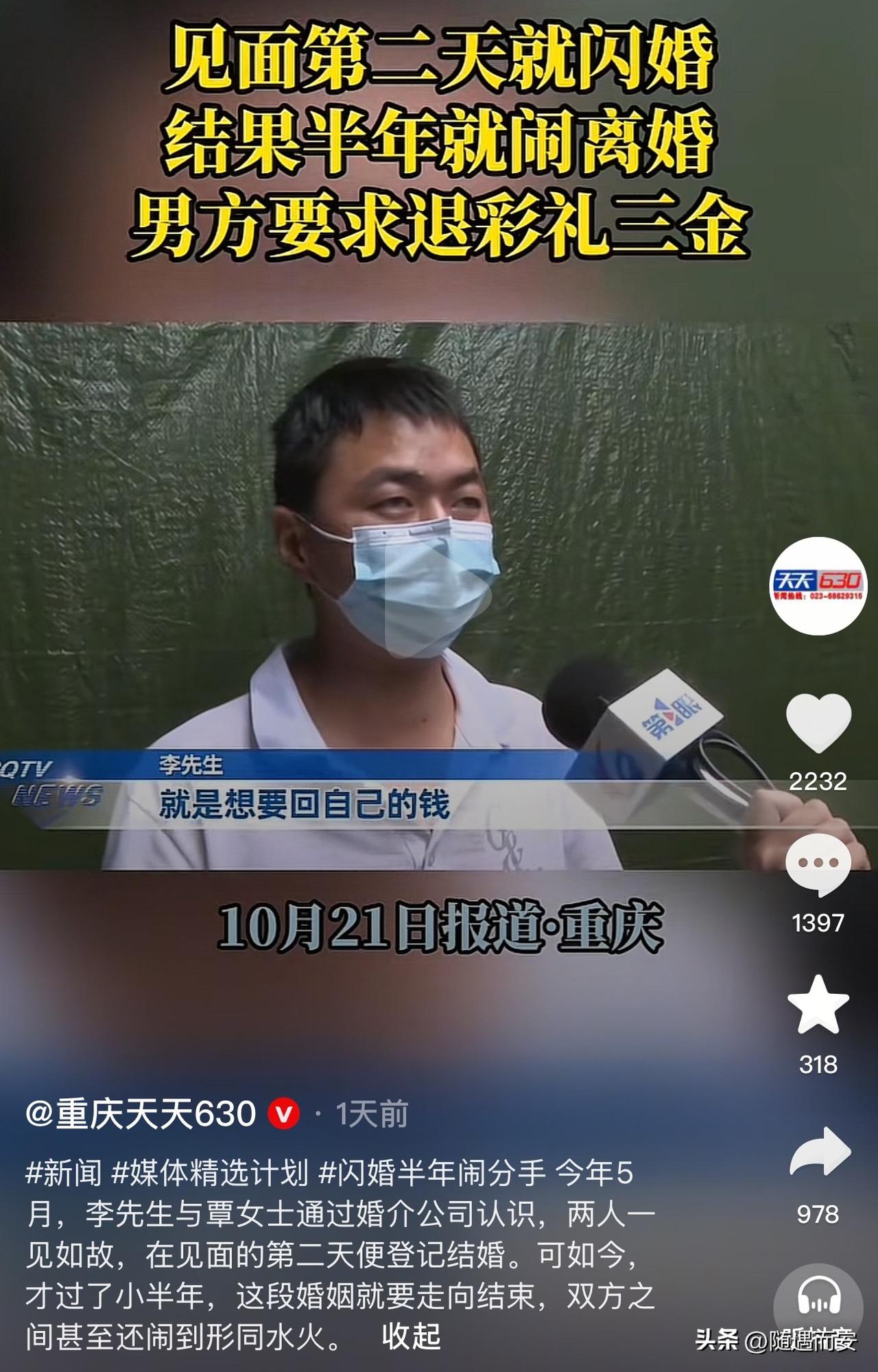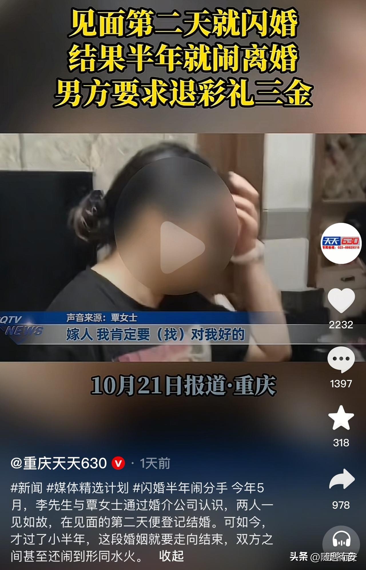 重庆一男子花了25万与一认识2天的离异女子闪婚,领证后,该女子以身体不舒服为由,拒绝跟男方住在一起。婚后才半年就闹起了离婚,两人因退还彩礼问题搞得水火不容! 今年5月份,重庆的李先生通过婚姻介绍所认识了离异的秦女士,对方大大咧咧的性格吸引了他,秦女士对他也一见如故。 由于父母身体不好,同时也为了满足父母的要求,于是他俩在见面的第二天就领了证。 之后他俩也打算要个属于自己的孩子,所以秦女士到医院取出节育环。 手术之后,李先生回到湖北武汉打工,而秦女士则在自己家修养身体,从此俩人分居两地,日常通过网络交流。 今年9月份,李先生想让妻子到武汉跟自己一起生活,结果秦女士一直找借口推脱。 对此,李先生心里感到非常不舒服,认为对方不是诚心过日子,有骗婚的嫌疑。 他想到曾在领证当天,双方签订过一份协议,注明“如果本人无故关机失联,长时间回娘家,或以各种理由不在男方家生活,均视为骗婚,自愿赔偿礼金以及男方给的所有财物。” 为了这桩婚姻,他前后花了25万,彩礼10万,三金3万6,认亲红包差不多3万,酒席以及给女方花的所有钱差不多七八万,现在生活无法继续向前,他希望对方能按照协议退还这些钱。 秦女士认为李先生一家人不讲理,他们拿着自己全家人的照片在小区散布谣言,称自己一家人是骗子。 对于这段婚姻,她也是满腹委屈。 她表示自己是真心实意过日子,也想找个对自己好的,但是男方的做法令自己太失望了。 她称,做完手术后一直流血长达40多天,对方却不管不问,他们一家只关心什么时候生孩子,根本不在乎自己的身体。 而且自己所有的信息都是真实的,也实心实意带他认识所有的亲戚,所以她不存在骗婚,不会按照协议退还彩礼。 因此,双方因退还彩礼多少的问题,始终没有达成一致。 有重庆网友称,花那么多钱的从开始就应该会联想到是不咋靠谱的,女方只知道无限索取,更何况还是个二婚的,重庆哪里有那么高的彩礼嘛,一般都是1-6万左右,女方还都会带回来的。 也有网友称这都是婚介和女方合谋的套路。 这25万的教训着实有点惨痛,也给所有着急成家的人提个醒,找个人结婚过日子不是赶工期,俩人认识要慢慢处,多带对方见见亲友,让他们把把关,见面次数多了,套路才容易露馅,别让着急蒙蔽双眼,掉进“闪婚”的大坑。 朋友们,对此,你们有什么看法?