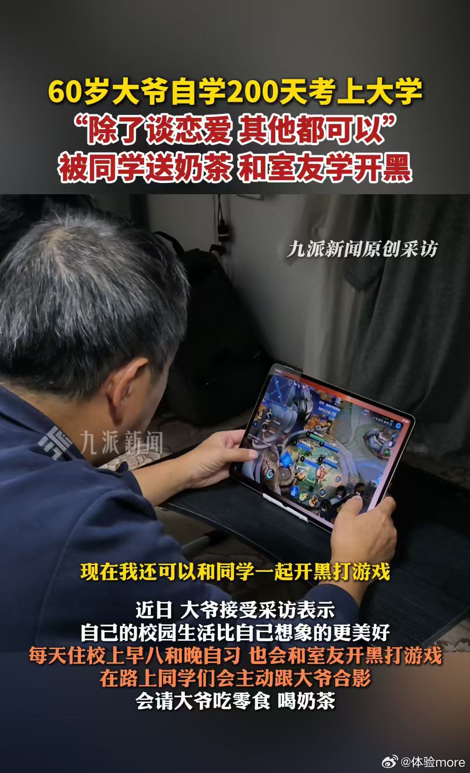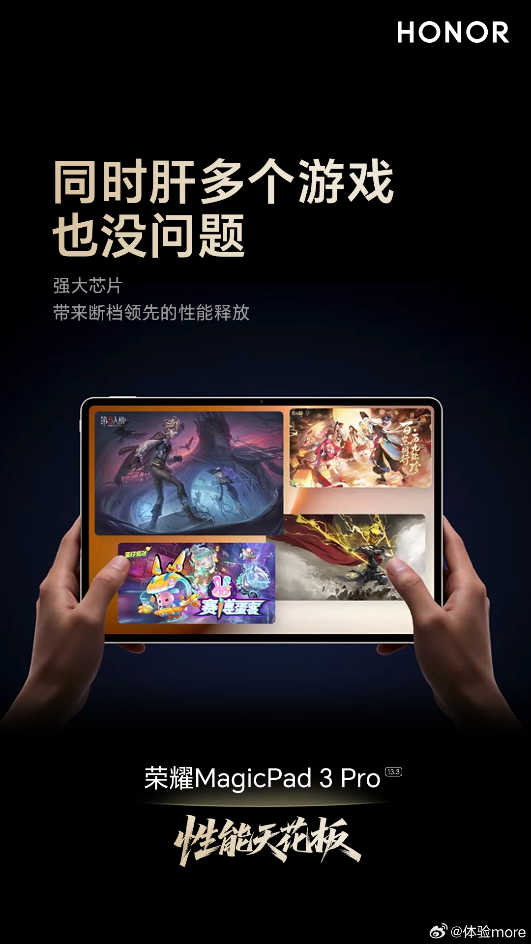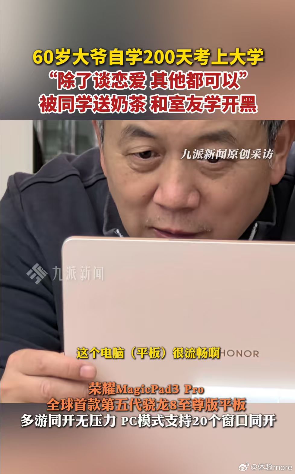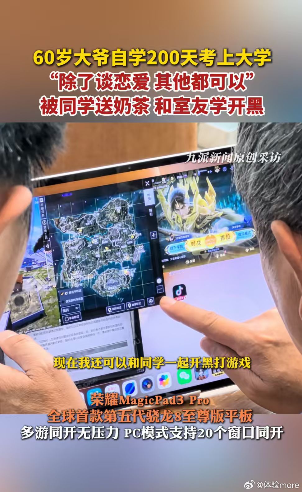 也是起猛了,居然看到60岁上大学大爷和室友学开黑,还打开好几个游戏同时肝,这个年纪有这毅力,做什么都会成功的,不过大家都在关注大爷,而我更关心的是他用的荣耀MagicPad3Pro,这个平板简直是性能天花板,搭载全球首款第五代骁龙8至尊芯片,带来断档领先的性能释放,同时肝多个游戏也没问题,打游戏时,屏幕刷新率和游戏帧率对齐,操作起来也太爽了,还有12450mAh的大电池,简直是肝帝福音,哪个打游戏的不想拥有一台。