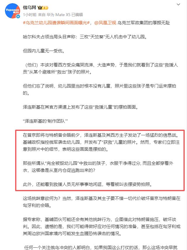 俄乌又吵起来了,这次是因为乌克兰方公布俄军袭击幼儿园造成1死6伤的事情。 这事一出俄罗斯受到了大量的指责,但是很快就有新的新闻称,这都是乌克兰自导自演的,到底谁说的才是真的? 视频里能看到爆炸现场还是挺惨烈的,但是另一方消息却称,这都是假的。 理由也很直接,幼儿园里根本没有孩子,而后来被拉去的孩子都是摆拍的。 为啥这样说呢?他们拿出照片举例,说孩子们身上都是干干净净的,完全是自导自演的挑衅。 最近确实特朗普和普京有会晤的打算,但是回过头来想,泽连斯基真会拿孩子来摆拍这种事情吗? 而且就算特朗普和普京见面谈判也不一定就能成,泽连斯基不用这样做吧? 其实纵观俄乌之间的新闻,经常都是没有实锤的,经常是一方放出消息后,另一方就会叱责是假的,双方各执一词,让外界看得云里雾里,难以分辨真相究竟如何。 这种信息战在俄乌冲突中屡见不鲜,一方面是为了争取国际社会的同情与支持,另一方面也是对对方心理和舆论的双重打击。 在缺乏独立第三方调查和确凿证据的情况下,公众往往只能根据自身的立场和偏好来选择相信哪一方的说法。 而这也进一步加剧了俄乌之间的对立情绪,使得冲突的解决变得更加困难和复杂。 现在看来,如果想要看俄乌战争结束,就要看什么时候他们能拿出诚意了,如果一直都像现在这样,那其实不管是什么普来调停也没用。 你怎么看待这件事?