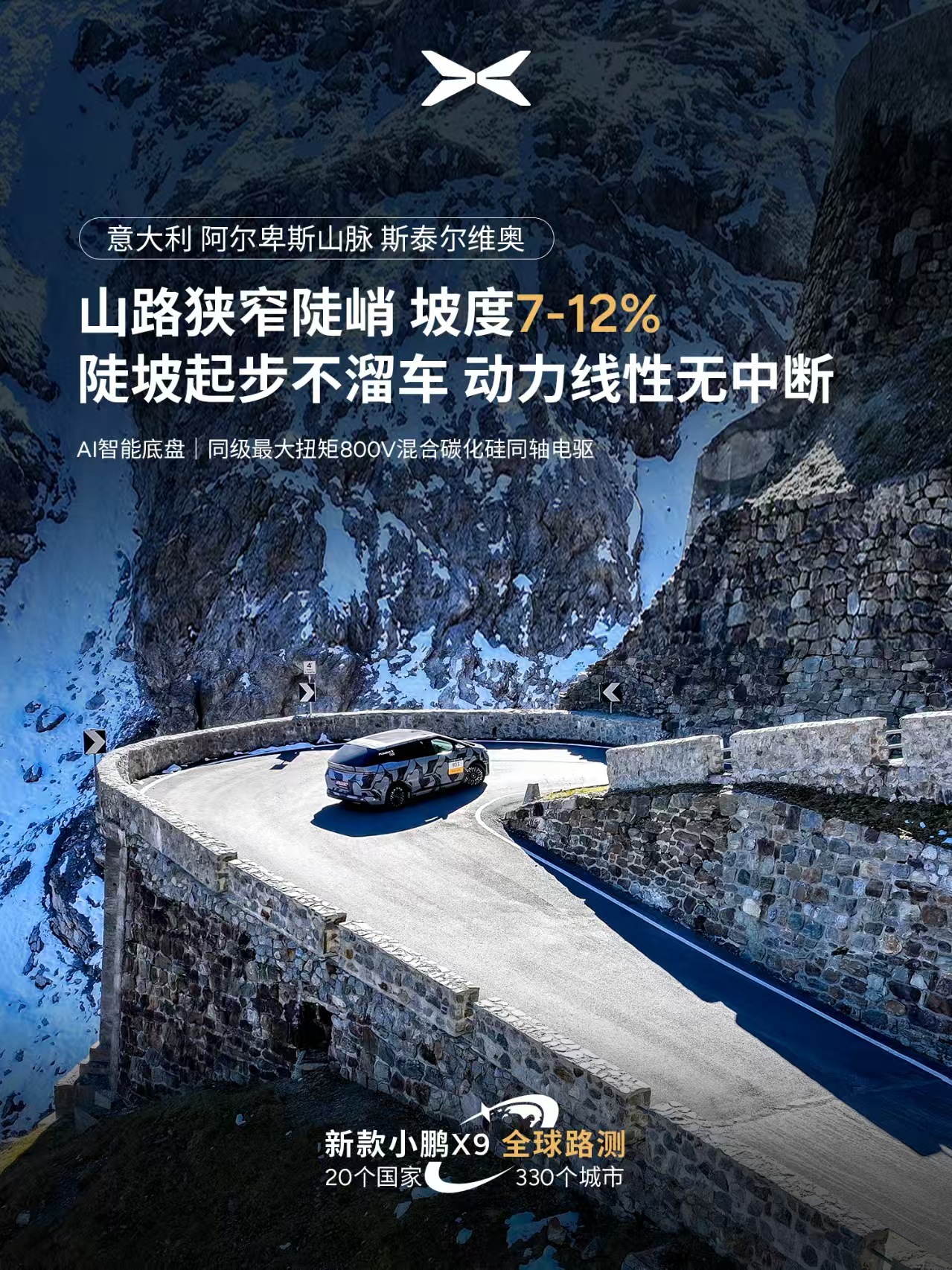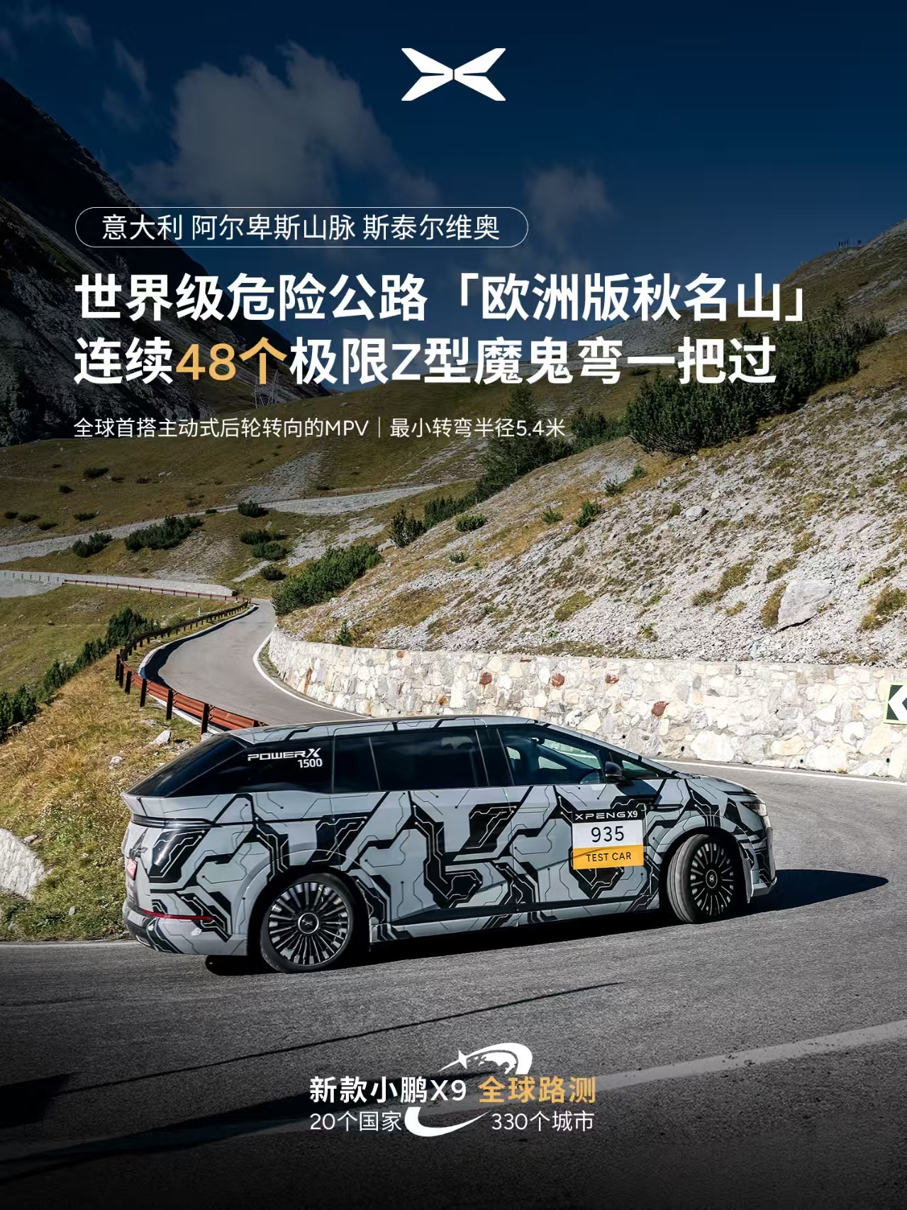 在不限速高速路上顶着大风大雨开到120km/h依然非常平稳、安静,意大利阿尔卑斯山脉斯泰尔维奥连续极限盘山弯道,新款小鹏X9丝滑通过连续48个极限Z型魔鬼弯,高海拔连续爬坡表现稳定。