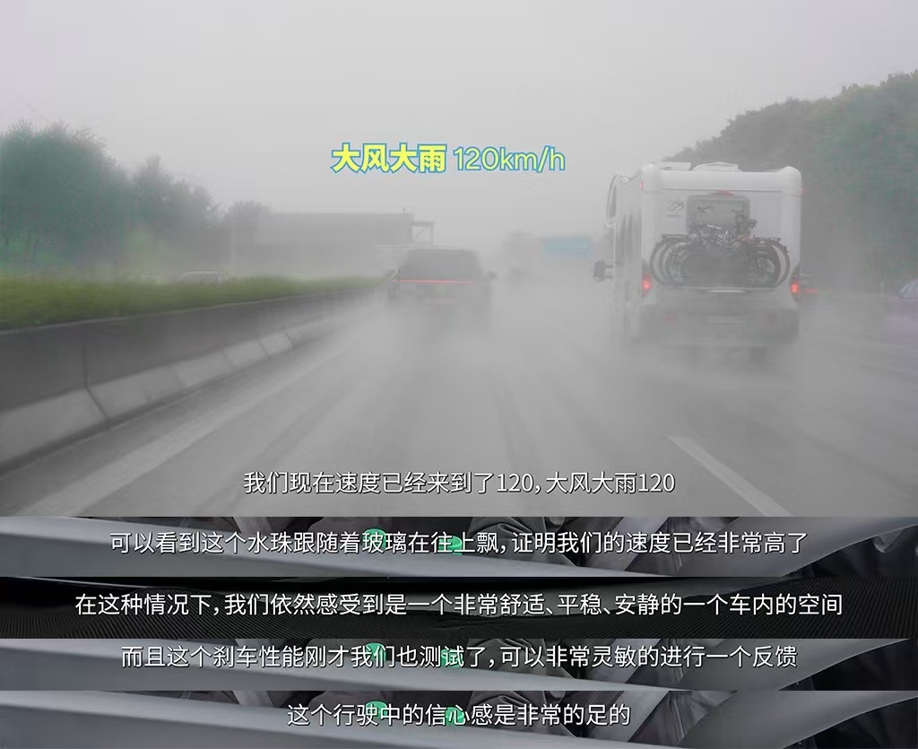 大师兄他们还在德国的不限速高速上,顶着大风大雨的天气开到120km/h,我看着都有点害怕。但是新款小鹏X9的NVH表现依然不错,平稳又舒适,何小鹏不限速高速测X9直呼太安静。