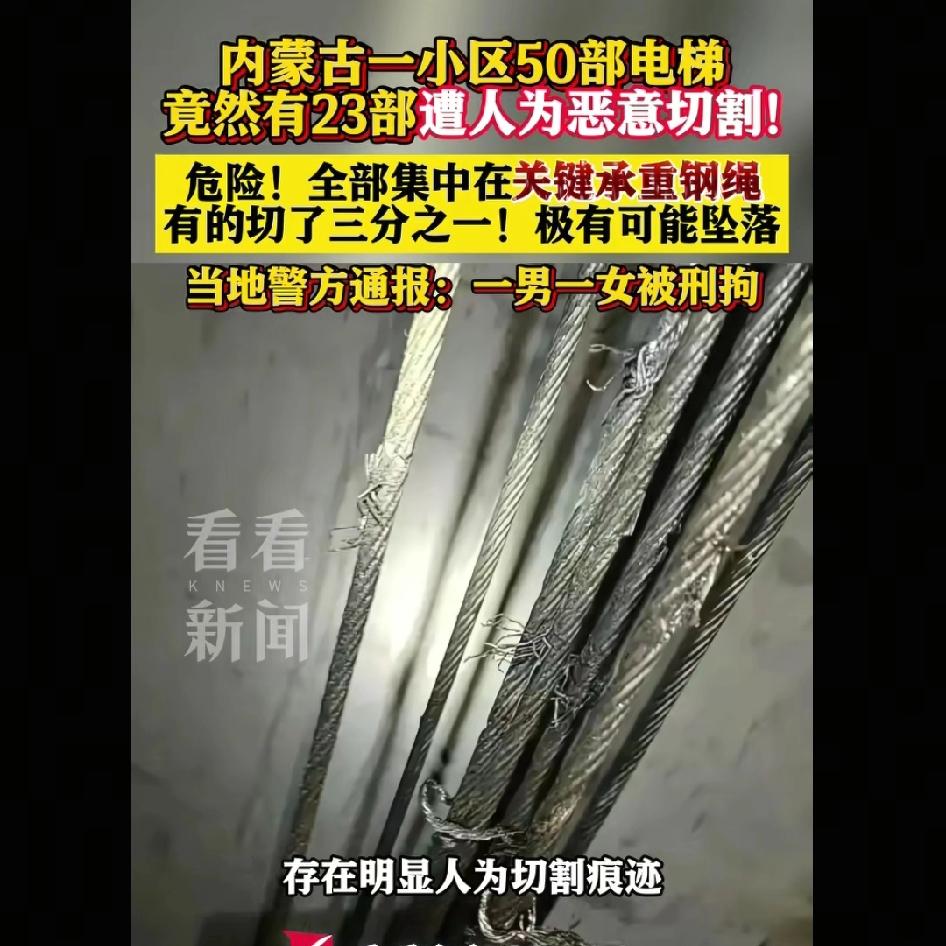 内蒙古呼和浩特一小区,50部电梯中有23部承重钢绳被人恶意切割!一男一女37岁,有预谋有计划的行动,这种人好恐怖,只考虑自身利益,不顾别人死活!幸亏新接手的物业挨个检查电梯才避免发生事故。 你跟物业有矛盾你找物业,找律师,总之找别的一切解决办法,这种做法太极端了!