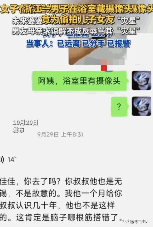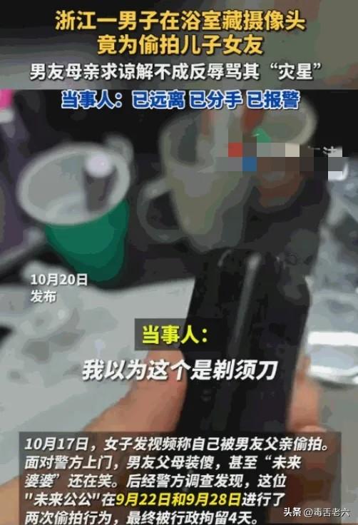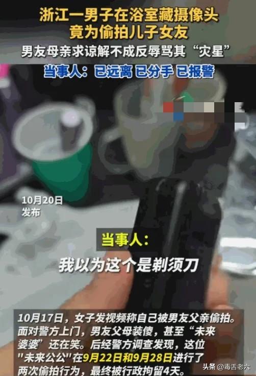 这样的家庭谁敢嫁!”10月20日报道,浙江一女子在男朋友家洗澡,想拿自己的面膜时,摸到一个发热的剃须刀,她觉得很奇怪,就看了一下,结果发现是一个摄像头,她马上意识到是未来公公偷拍她,她赶紧跟未来婆婆说,婆婆竟然笑着替丈夫辩解,女子震惊,就报了警,结果未来婆婆就骂她是灾星。 看完这事儿我直犯恶心。浴室多私密的地方啊,洗澡时连个放松的地儿都没有,还得提心吊胆防着偷拍。 更离谱的是未来婆婆那态度——亲儿子干这种缺德事,不骂不教育,倒先笑她、骂她灾星?合着在她眼里,儿子的恶行比姑娘的尊严还金贵? 有人可能说,说不定公公就是手贱好奇?可再好奇,浴室装摄像头算哪门子“好奇”? 这是把别人的身体当猎奇素材,把人最放松的时刻当监控画面存着,本质是对女性隐私的践踏。 更扎心的是,这种伤害发生后,本该护着她的婆家反而站到了加害者那边,女孩孤立无援才逼得报警。 现在人被拘了,但女孩和男友的关系呢?就算男孩站出来道歉,这事儿就能翻篇? 往后洗澡还敢不敢关浴室门?睡他家床还敢不敢换衣服?隐私一旦被侵犯,信任的裂痕根本补不上。 各位读者你们怎么看?欢迎在评论区讨论。